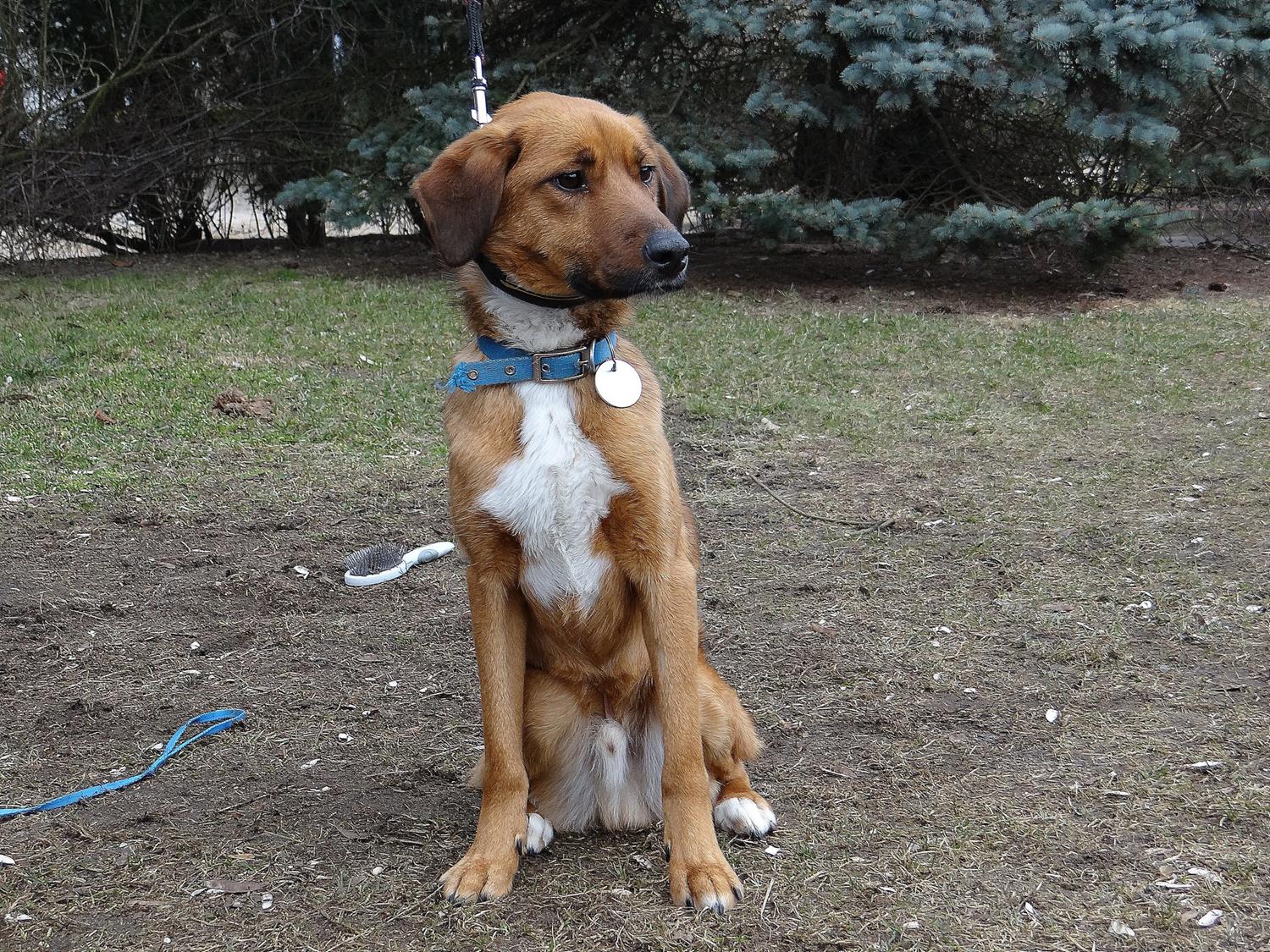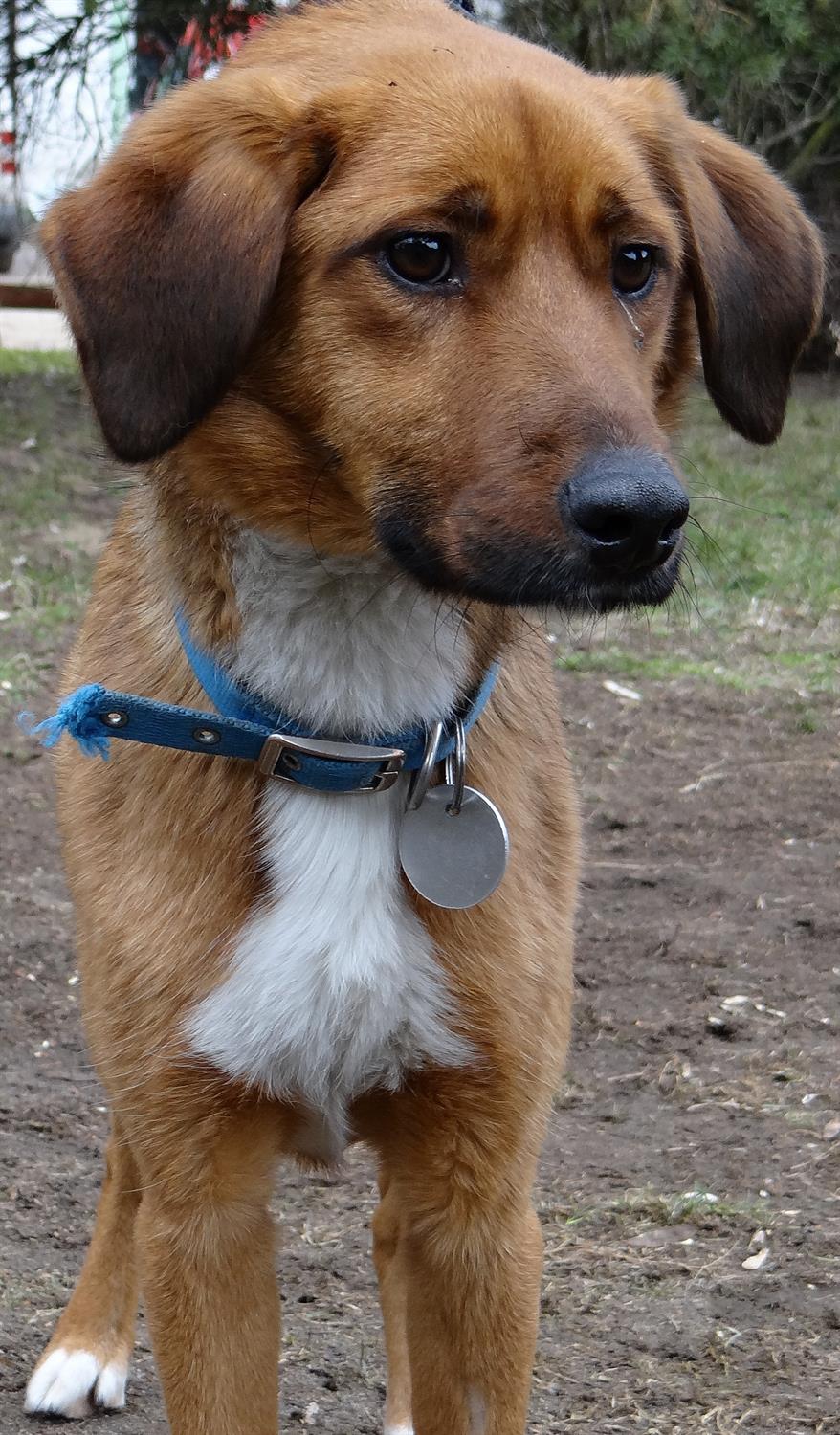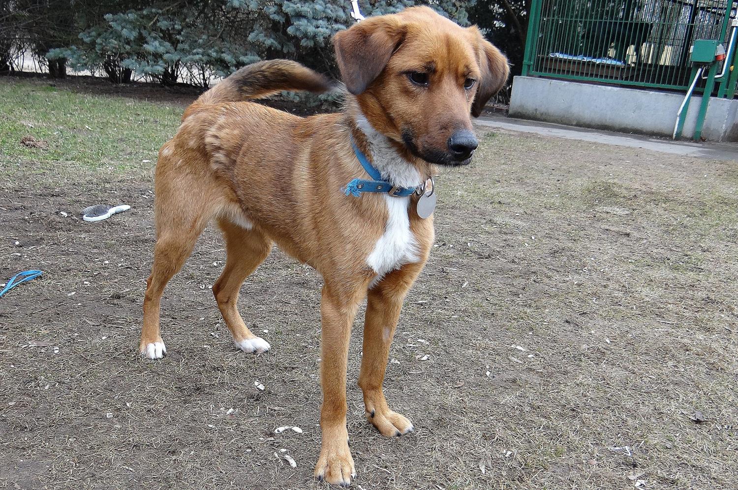 Młody, stąd w pełni sił i żywiołowy. Radosny, choć już po przejściach. Psiak o zamglonych bursztynowych oczach i rozbrajająco klapniętych uszach, fruwających w podskokach. Jedyny w swym rodzaju przebojowy schroniskowy elegancik: pod krawatem i w białych „kaloszkach".