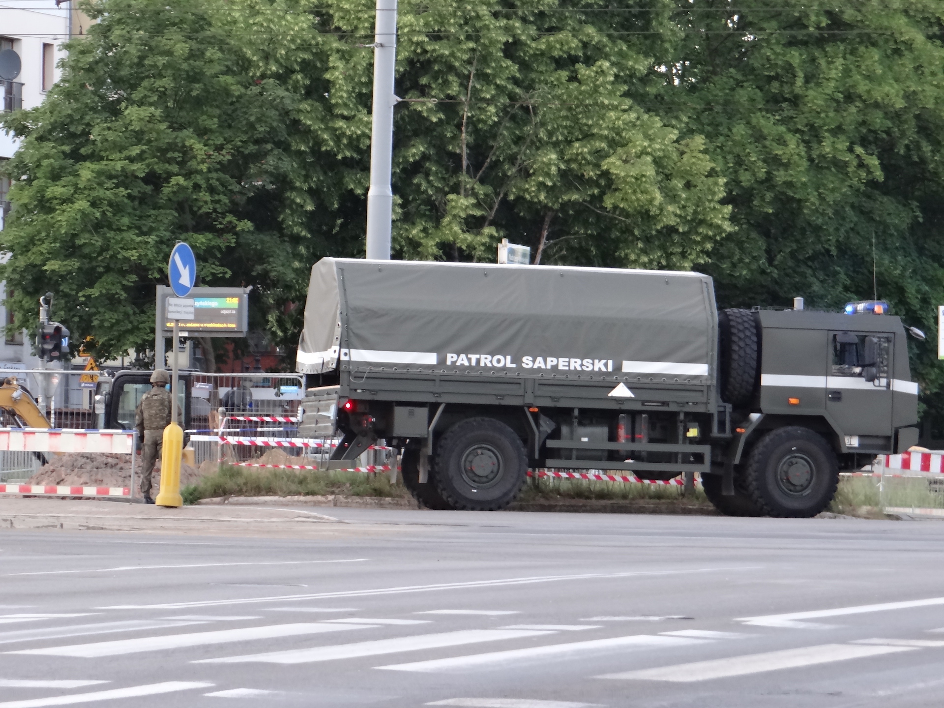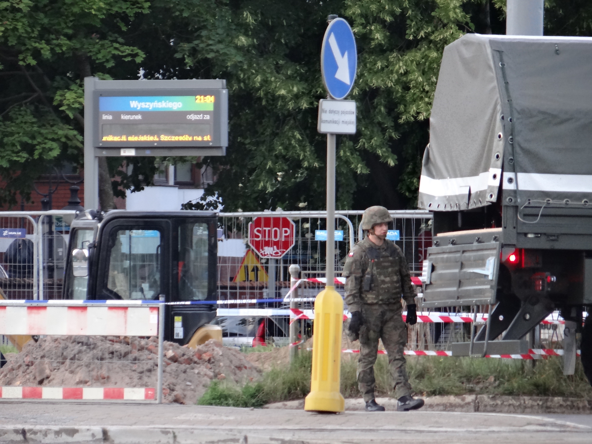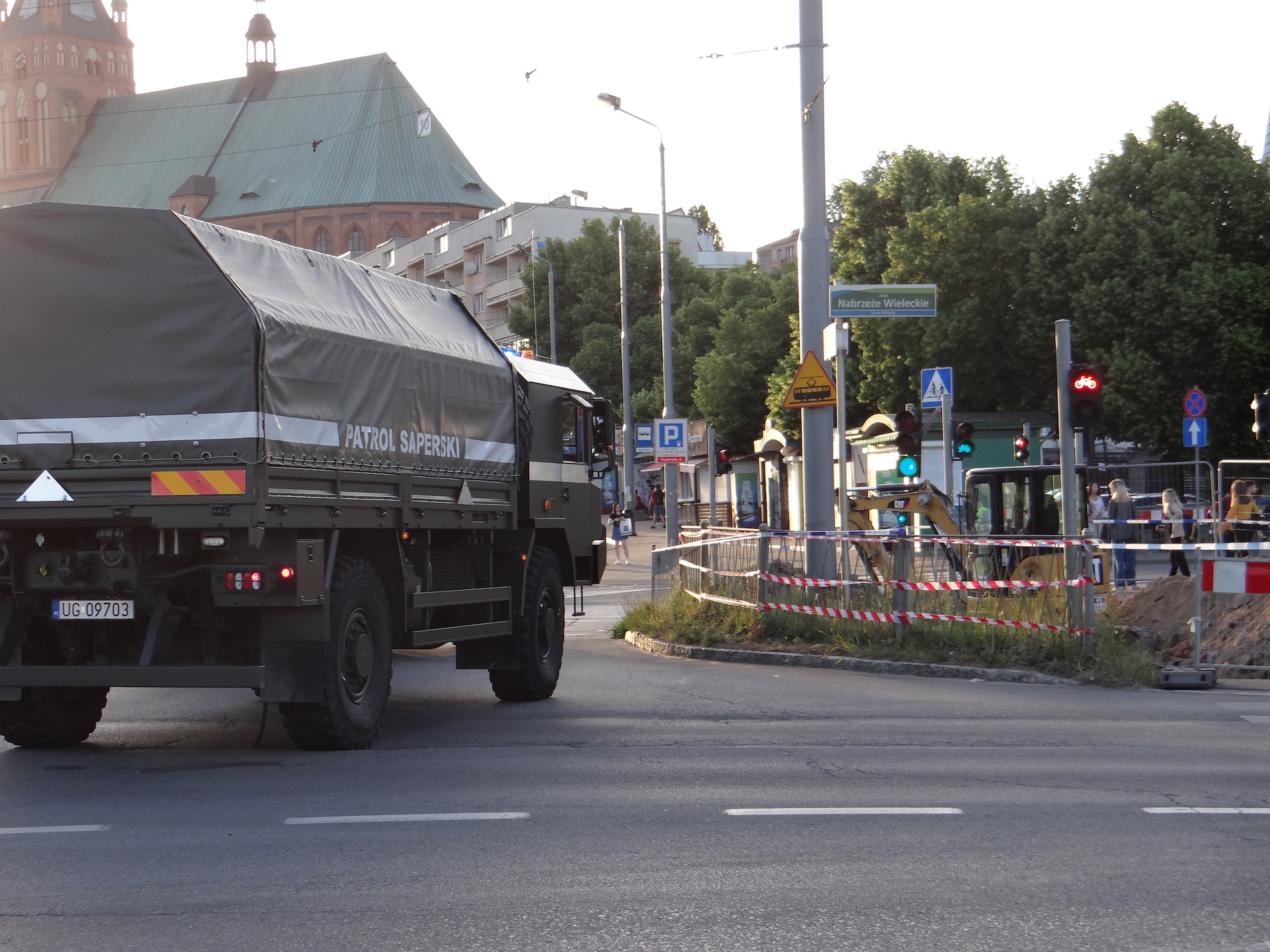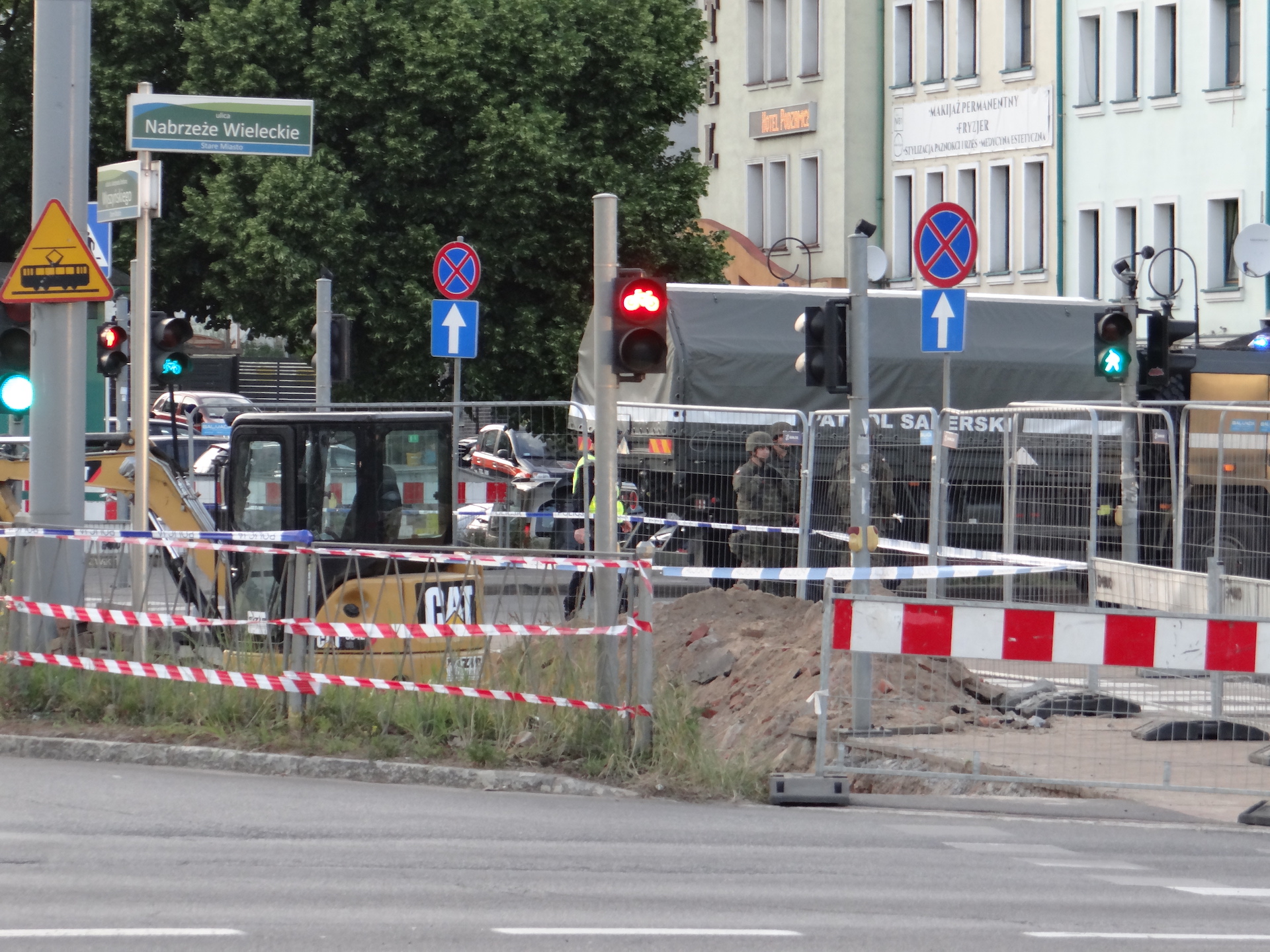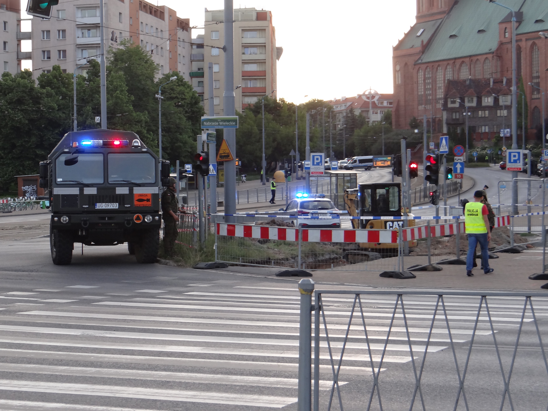 Tuż przy skrzyżowaniu ulic Nabrzeże Wieleckie, Wyszyńskiego, gdzie ruszyły wykopy w pasie zerwanego torowiska, drogowcy natknęli się na pocisk tkwiący w ziemi. O godz. 20.20 pojawiły się wozy patrolu saperskiego, a cały teren obstawili funkcjonariusze patroli z kilkunastu radiowozów. W rejon nabrzeża i bulwaru Piastowskiego skierowane też zostały patrole Straży Miejskiej i służb nadzoru ruchu ZDiTM. A także, na wszelki wypadek, karetka pogotowia ratunkowego.