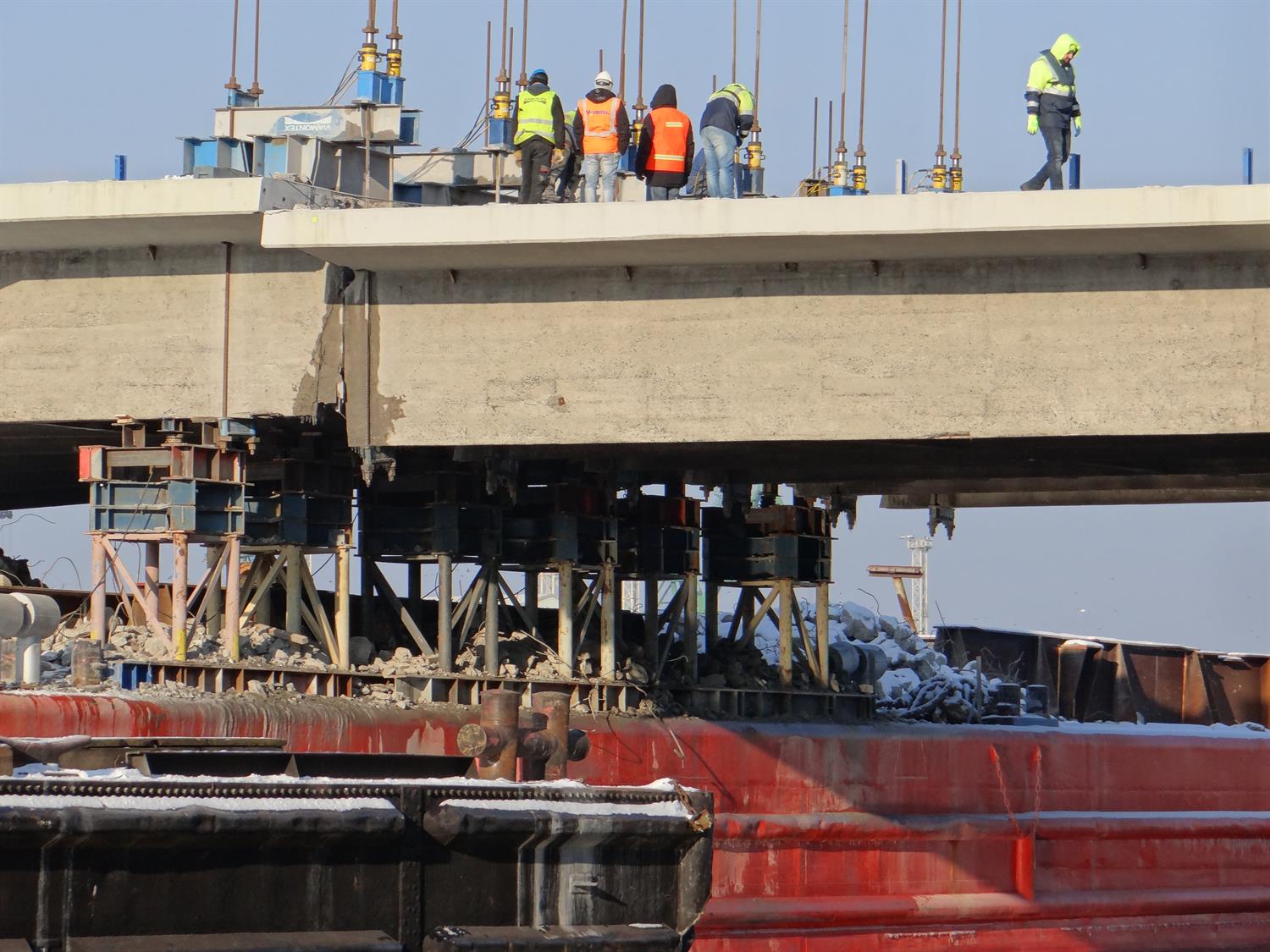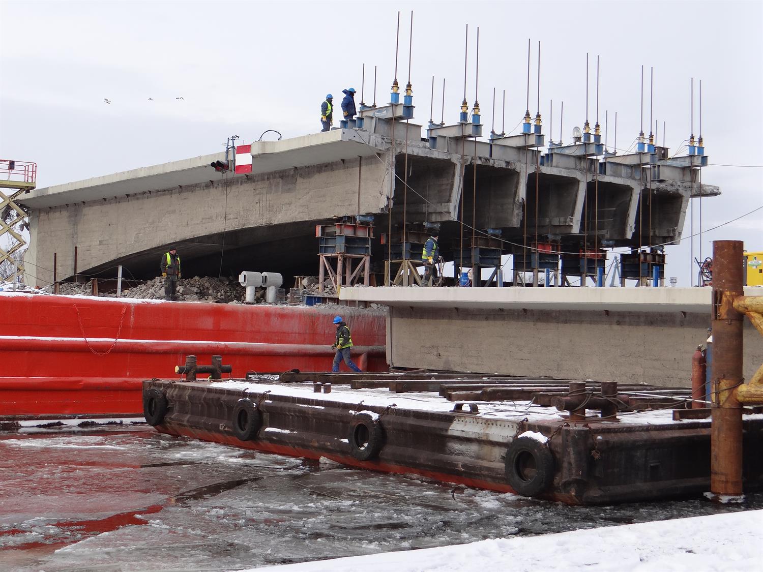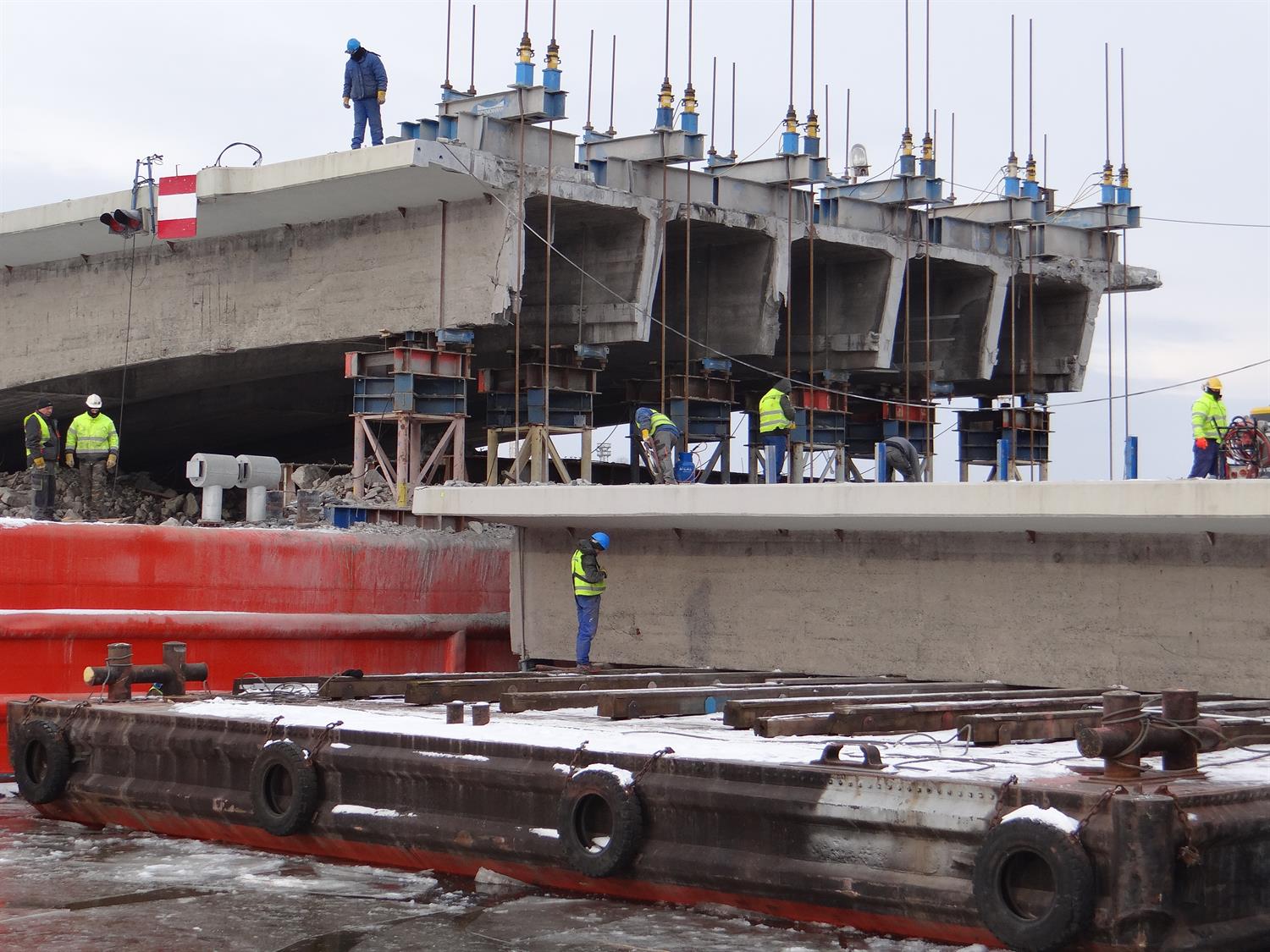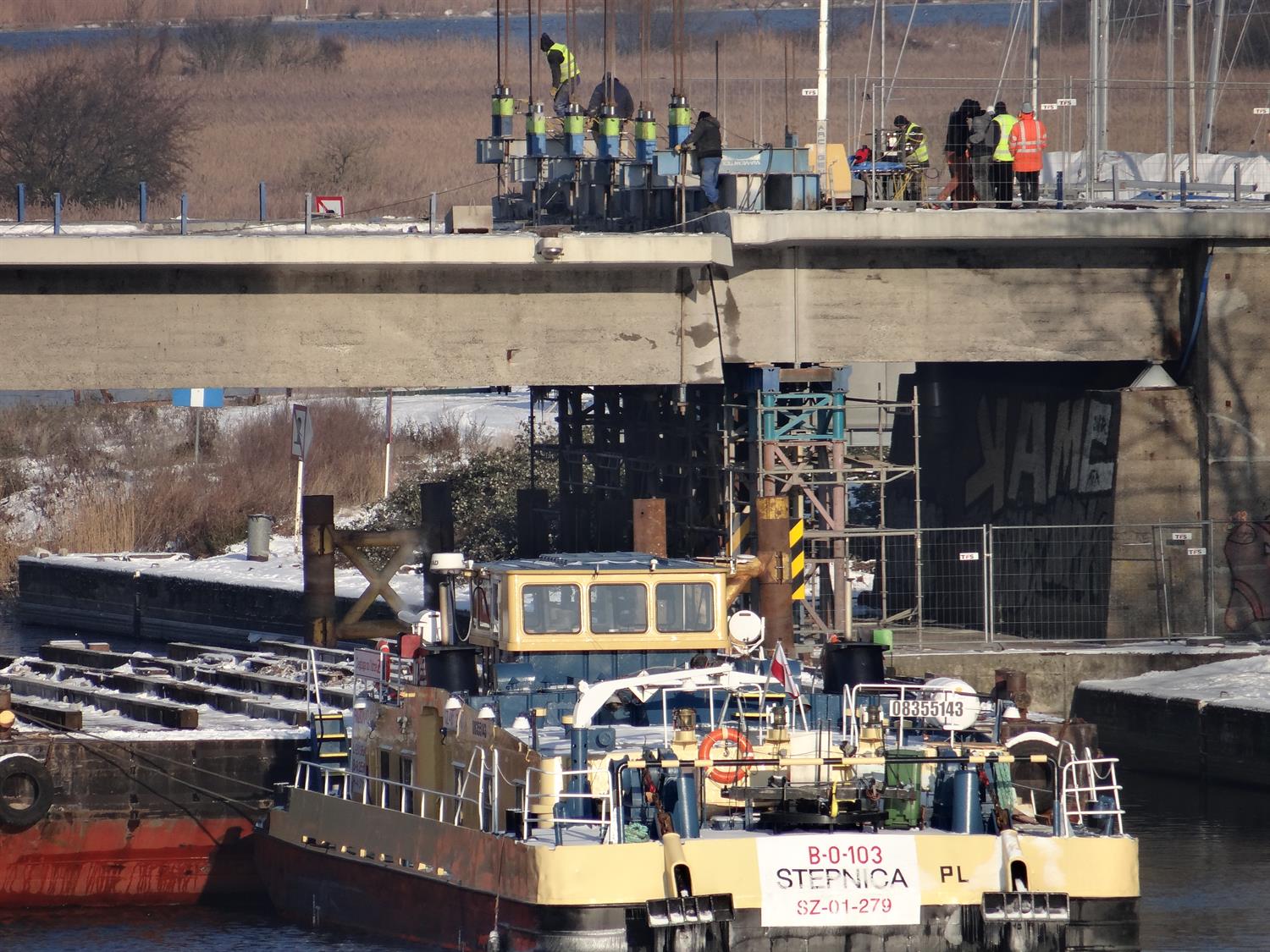 Pozostałe części są sukcesywnie cięte podłużnie oraz poprzecznie i także opuszczane za pomocą dźwigów na platformach pływających. Sprzęt specjalistyczny wspomagają popularne szczecińskie Bizony. Po realizacji tej części umowy wykonawca przystąpi do napraw i konserwacji filarów oraz odsłoniętych przyczółków. Przekazanie projektu wykonawczego i budowlanego obiektu powinno nastąpić do końca stycznia 2017 roku.