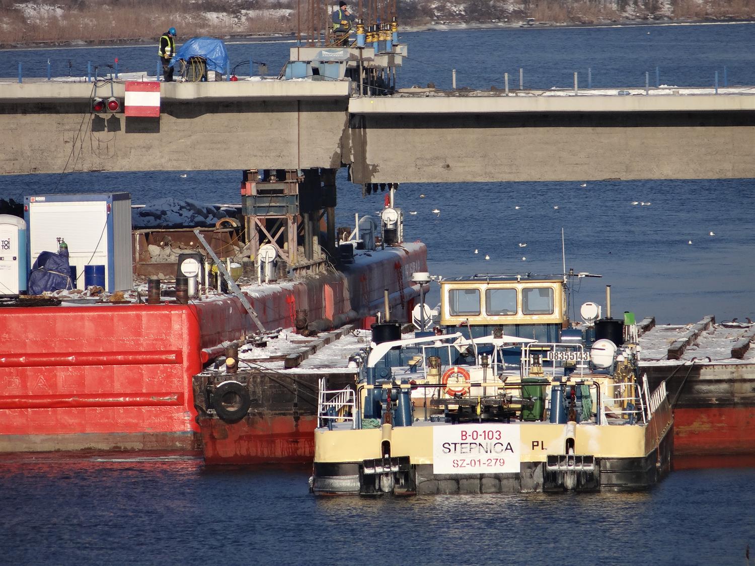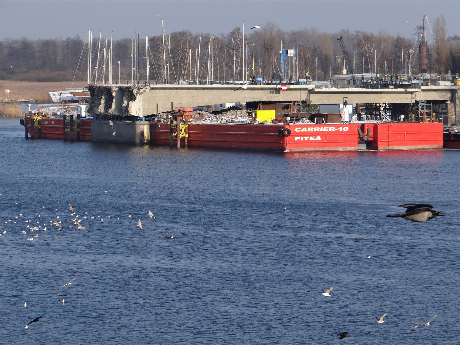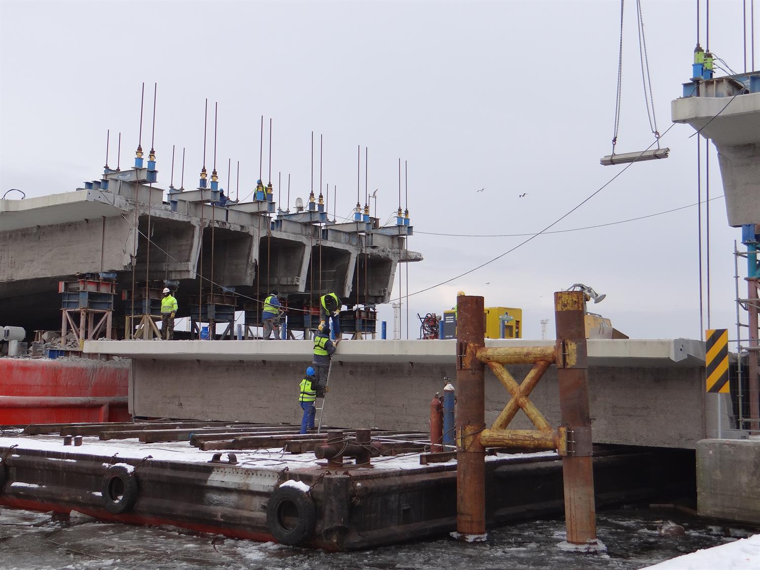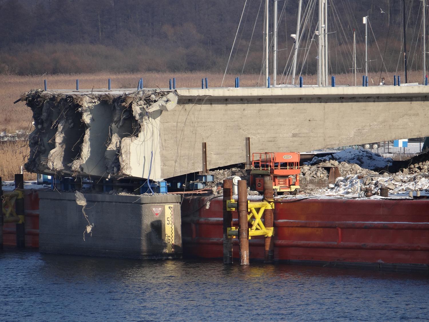 Pozostałe części są sukcesywnie cięte podłużnie oraz poprzecznie i także opuszczane za pomocą dźwigów na platformach pływających. Sprzęt specjalistyczny wspomagają popularne szczecińskie Bizony. Po realizacji tej części umowy wykonawca przystąpi do napraw i konserwacji filarów oraz odsłoniętych przyczółków. Przekazanie projektu wykonawczego i budowlanego obiektu powinno nastąpić do końca stycznia 2017 roku.