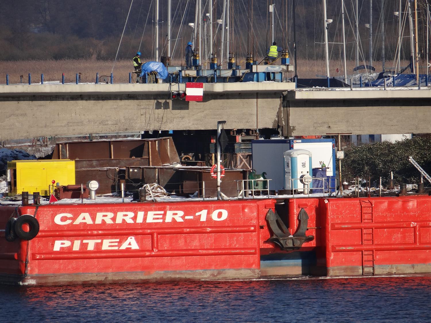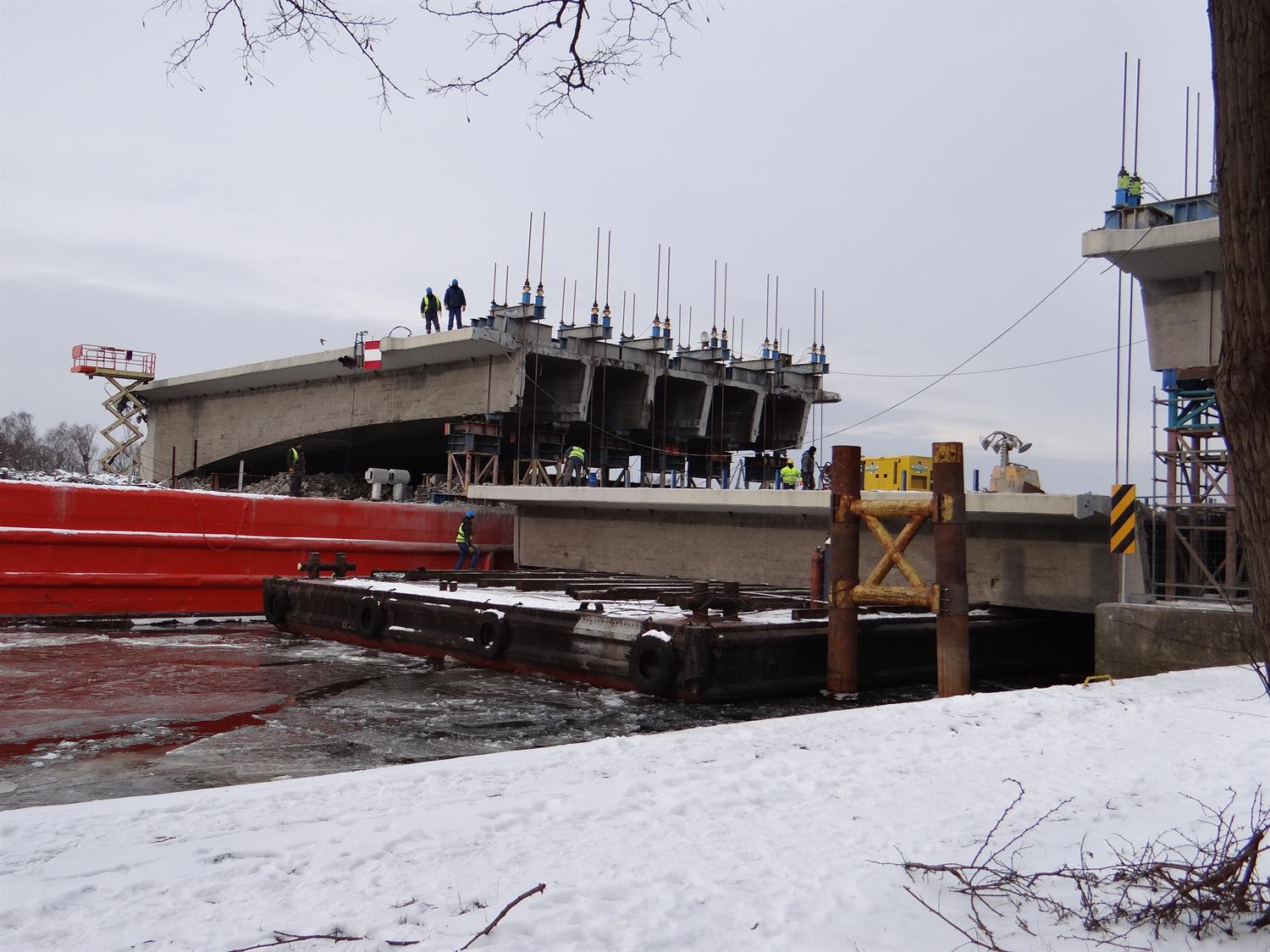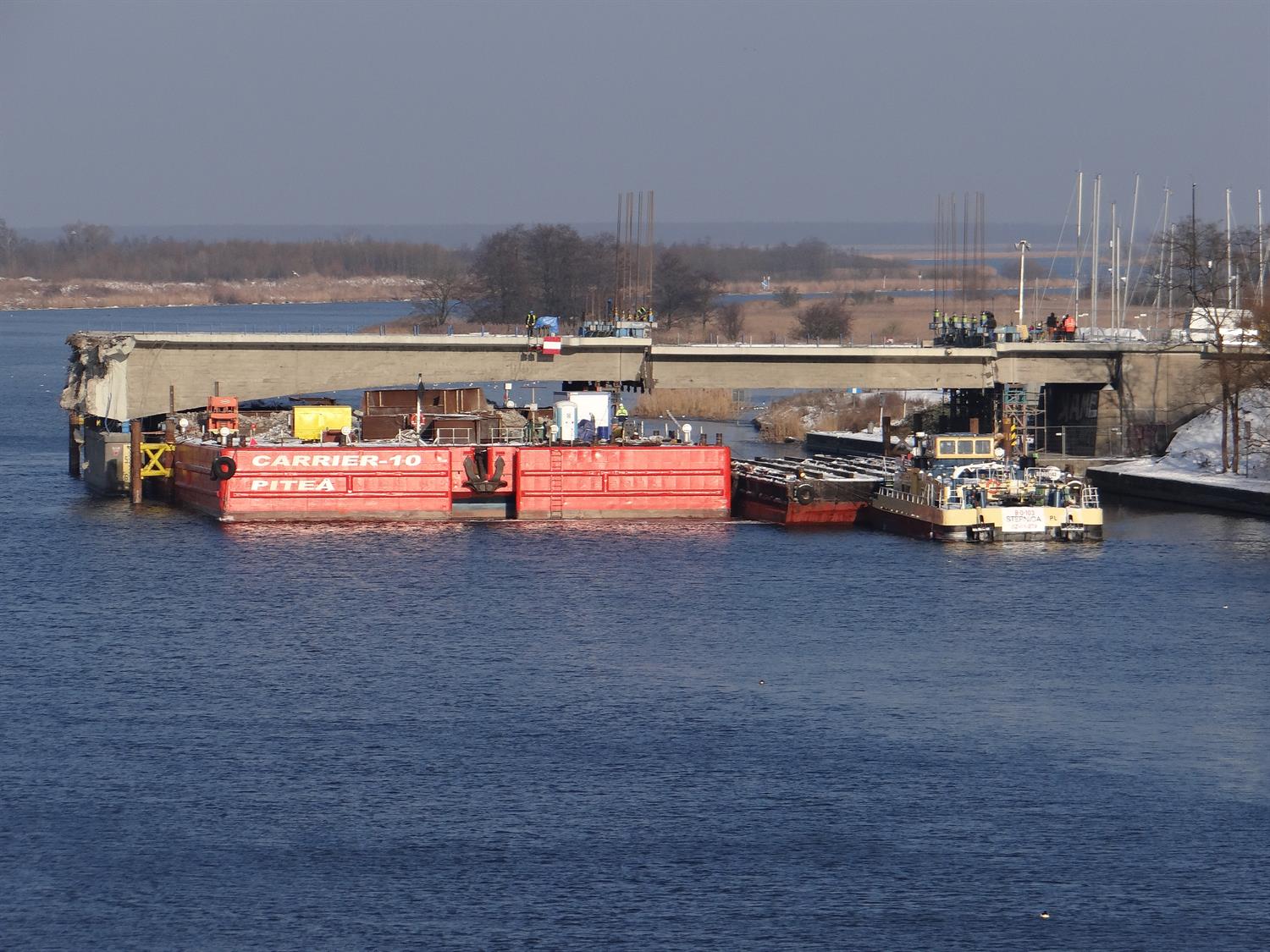 W szybkim tempie znika znad Regalicy stara konstrukcja tej przeprawy. Nie wyhamowały go nawet wysoki stan wód, spowodowany silnymi wiatrami, które wywołały cofkę, ani też śnieżne i mroźne dni w pierwszej połowie stycznia. Przypomnijmy, że tuż przed świętami w grudniu zdemontowane zostały dwa ostatnie fragmenty przęsła zachodniego, czyli od przyczółka na lewym brzegu rzeki. A na początku grudnia 2016 r. demontaż przeprawy rozpoczął się od rozbiórki kawałek po kawałku przęsła środkowego.