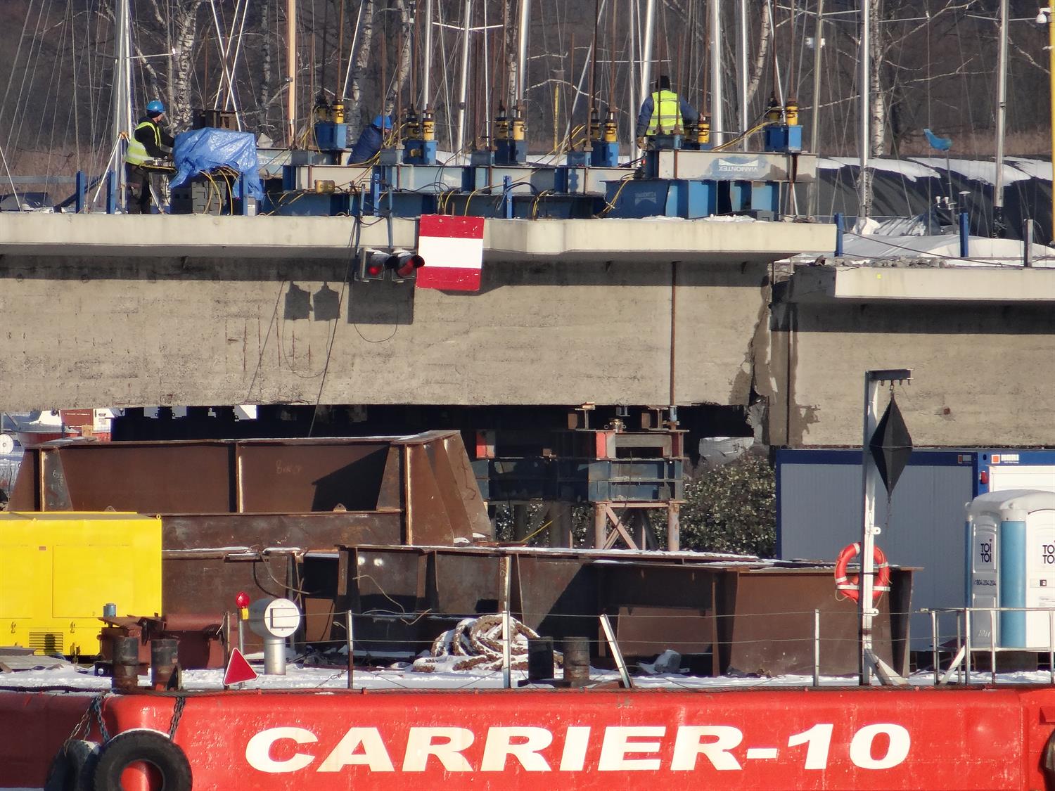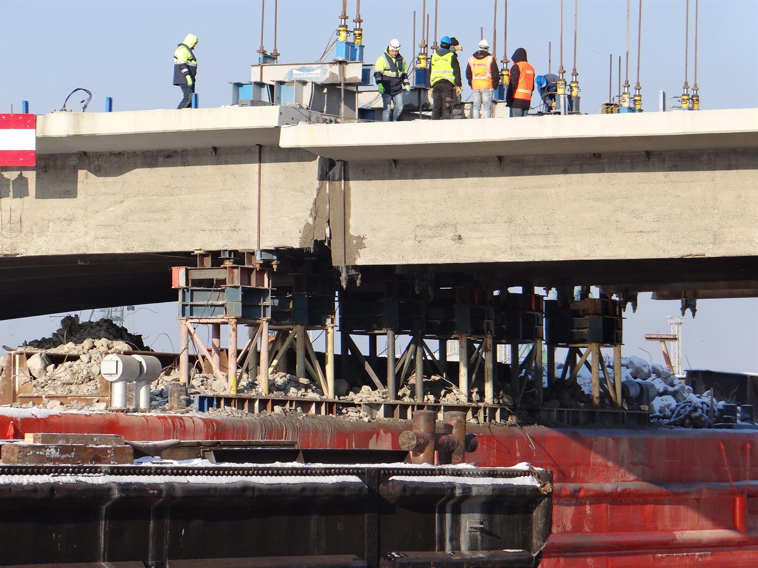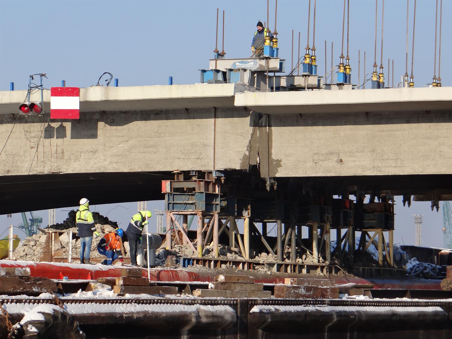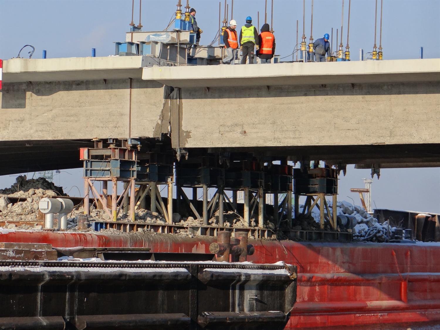 W pierwszej kolejności podparte zostało przęsło, które uległo awarii. Następnie podniesione i wysunięte zostało przęsło środkowe. Ten etap był najbardziej skomplikowany i trwał w sumie dwa dni. Podczas robót pomocne są dwie specjalne jednostki pływające: Carier 10 o wyporności 10 tys. ton, na którym ustawiono rusztowanie podpierające przęsło zachodnie, oraz Carier 4 (o wyporności ok. 4 tys. t) służąca do tego, by rozpocząć rozbiórkę, która zaczęła się właśnie od demontażu przęsła tzw. zawieszonego, gerberowskiego, czyli środkowego.