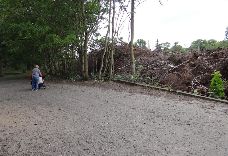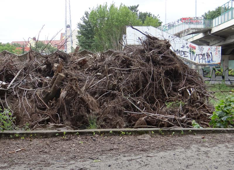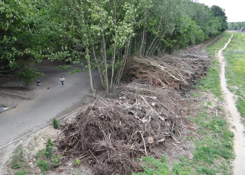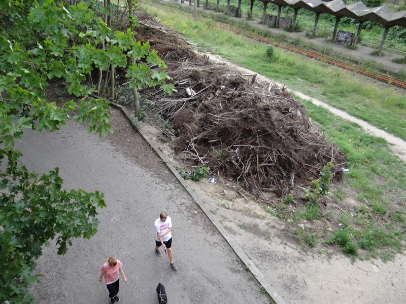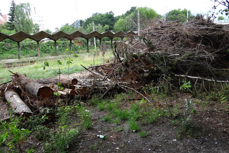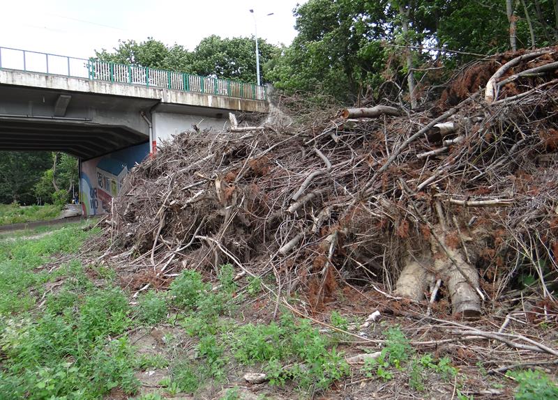 Długa hałda ściętych pni i gałęzi, miejscami sięgająca nawet trzech metrów wysokości, od miesięcy zalega w bezpośrednim sąsiedztwie parku Noakowskiego oraz objętych ochroną konserwatorską dachów stacji Pogodno.