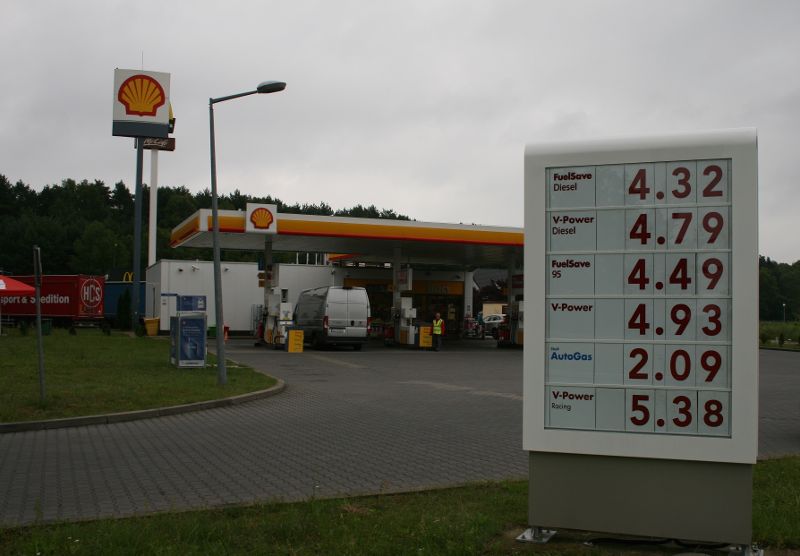 W Babigoszczy (też Orlen) ceny były odpowiednio: E 95 - 4,53, a ON - 4,37 zł. Na zdjęciu pokazujemy ceny na stacji Shell, koło wspomnianego McDonalda. W Przybiernowie na prywatnej stacji płaciliśmy 4,45 (95) i 4,35 zł (ON).