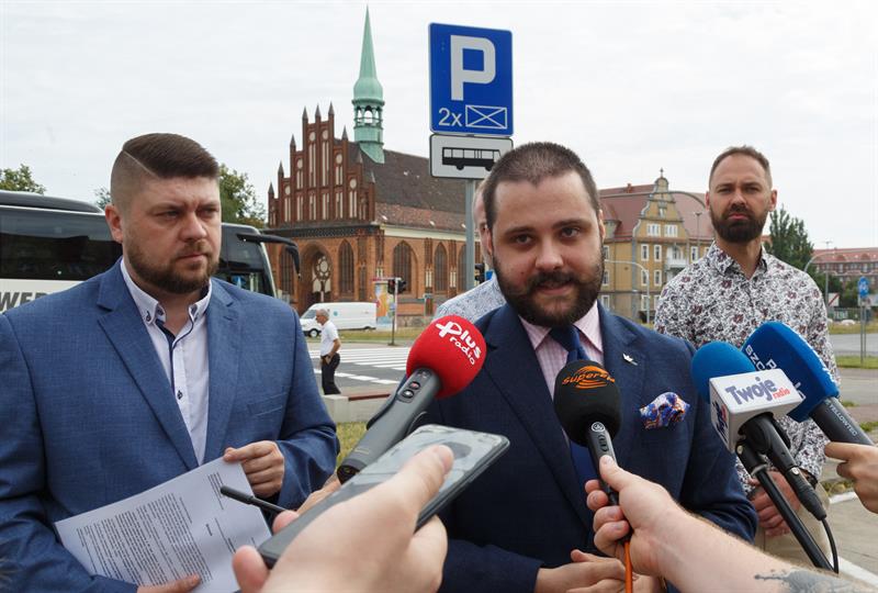 Działacze Nowej Nadziei zorganizowali konferencję prasową na ulicy Farnej w Szczecinie, obok miejsca parkingowego dla autokarów. Fot. Ryszard Pakieser