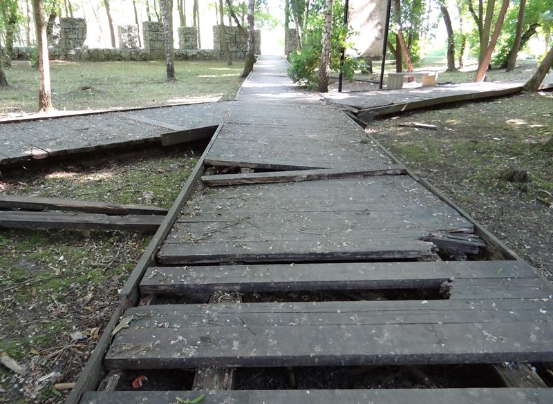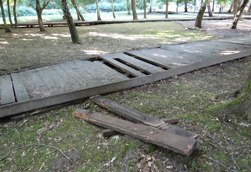 Problem w tym, że tak nieskutecznie miejskie służby usiłowały „chronić" przed nieszczęściem, z jakim nieuchronnie się wiąże korzystanie z alejek wyniesionych nad poziom gruntu drewnianymi platformami. Ich deski butwieją i się zapadają. Połamane albo nie były wymieniane, albo naprawy szybko się okazywały nieskutecznymi. Dość, że teraz są pełne dziur i wystających gwoździ. Stały się niebezpiecznymi pułapkami na korzystających z parku.