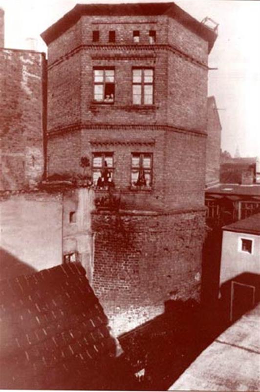 Podczas alianckich nalotów w sierpniu 1944 roku zniszczeniu uległa również baszta pełniąca wówczas rolę podstawy ośmiokątnej kamienicy. Na zachowanym starym zdjęciu widać wyraźnie, że kamienica została wpasowana w ciasną zabudowę starego miasta.