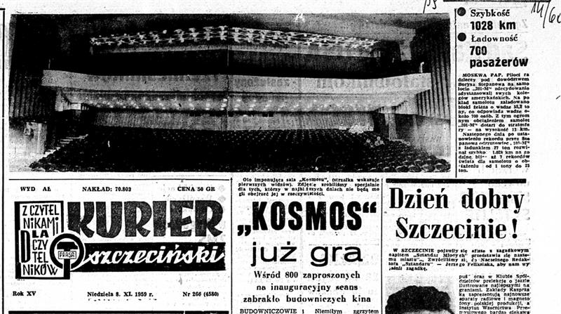 Inauguracyjny seans w nowoczesnym kinie zaplanowano na 22 lipca 1959 roku, w rocznicę ogłoszenia Manifestu Polskiego Komitetu Wyzwolenia Narodowego. W czasach PRL 22 lipca, zwany Świętem Odrodzenia Polski, był dniem wolnym od pracy i nadano mu rangę wielkiego święta narodowego. Tego dnia odbywały się liczne spotkania z propagandowymi akademiami oraz imprezy sławiące ustrój socjalistyczny i jego osiągnięcia. W Szczecinie tym osiągnięciem miało być oddanie do użytku kina „Kosmos”.