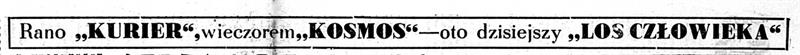 Następnego dnia, tj. 8 listopada 1959 roku, na pierwszej stronie „Kuriera” pojawił się następujący slogan: Rano „Kurier”, wieczorem „Kosmos” – oto dzisiejszy „Los człowieka”. Ci, którzy znają film lub książkę Michaiła Szołochowa, wiedzą doskonale, że jest to przejmująca opowieść o żołnierzu Armii Czerwonej oraz o przygarniętym przez niego małym chłopcu. Był to dramat wojenny, ale jednocześnie majstersztyk propagandowy, którego przesłanie sprowadza się do stwierdzenia, że radziecki człowiek nigdy się nie poddaje i walczy nawet z najgorszymi przeciwnościami losu – bo taki jest los człowieka…