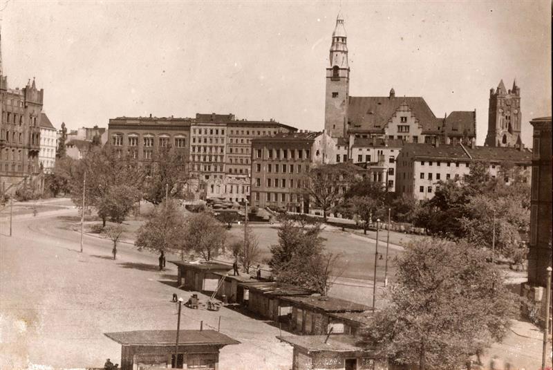 Niestety, pomnik nie przetrwał wojny. Podobny los spotkał również wiele sąsiednich kamienic zniszczonych podczas alianckich nalotów. Na zdjęciu widać wyraźnie wypalone okna Czerwonego Ratusza. To efekt podpalenia budynku już w końcowym etapie II wojny światowej. Ratusz został odbudowany w latach sześćdziesiątych XX wieku. Natomiast rynek działał w południowo-zachodniej części placu jeszcze do końcu lat 60. XX wieku.
