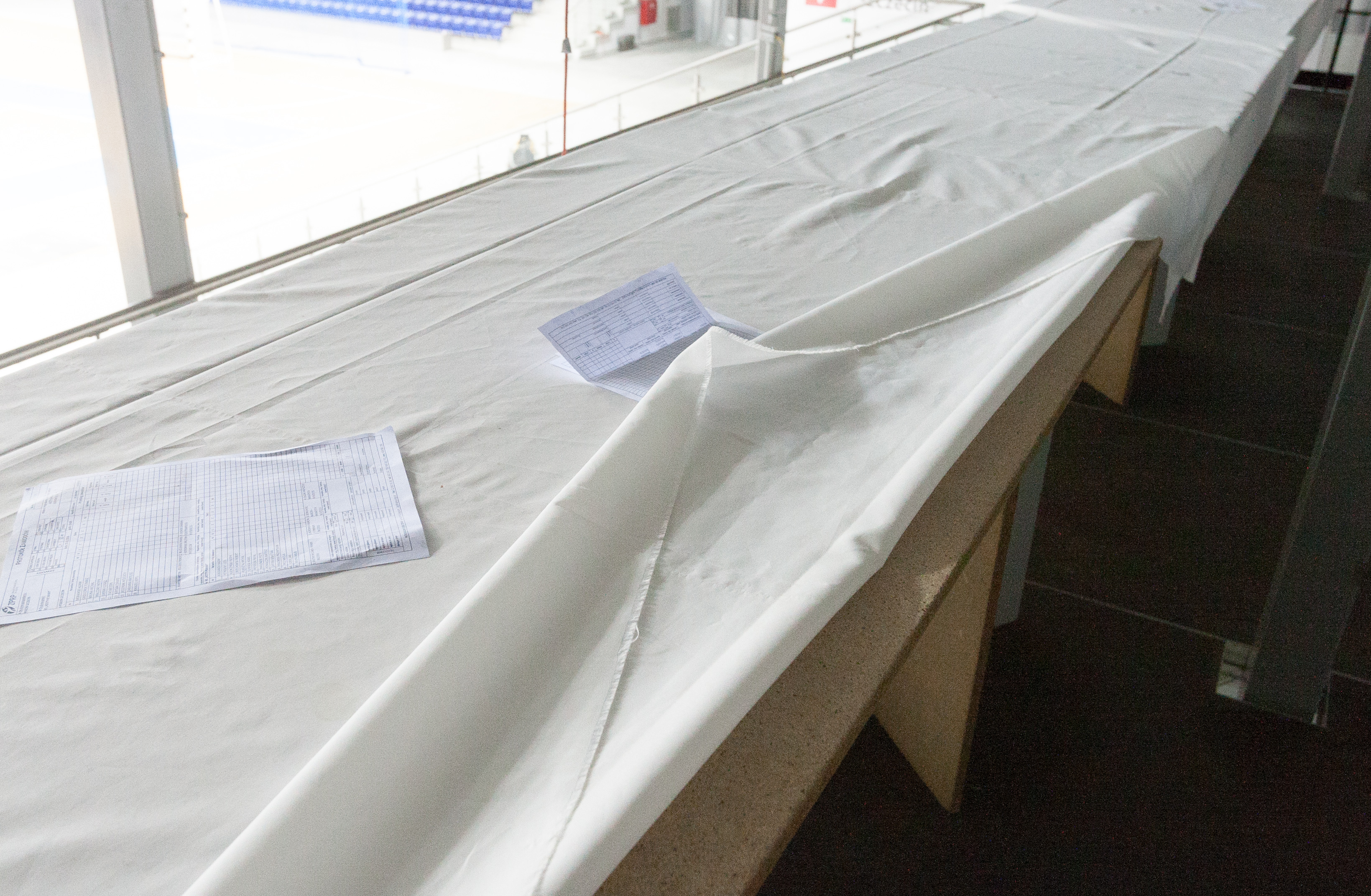 Na początku wszyscy myśleli, że miejsce, gdzie przyjdzie pracować dziennikarzom, jest rozwiązaniem tymczasowym. Tak jak to jednak u nas bywa, prowizorki trzymają się najdłużej. Oto mamy kilka zbitych w całość płyt pilśniowych. Na nie narzucony biały (a właściwie niegdyś biały) obrus, wystrzępiony na końcach. Kiedy parę dni temu robiliśmy to zdjęcie, by nie spadał, przypięto go... zszywkami, dokładnie takimi, jakich używa się do złączenia kilku kartek papieru. Pracować muszą przy nim nie tylko szczecińskie media. W ubiegłym tygodniu w hali odbył się międzynarodowy mecz w futsalu reprezentacji Polski i Kazachstanu. Do Szczecina przyjechali dziennikarze z Poznania, Krakowa, Warszawy. Tak naprawdę jednak nie ma znaczenia, czy pracują tutaj miejscowi czy też przyjezdni, liczy się sam fakt.