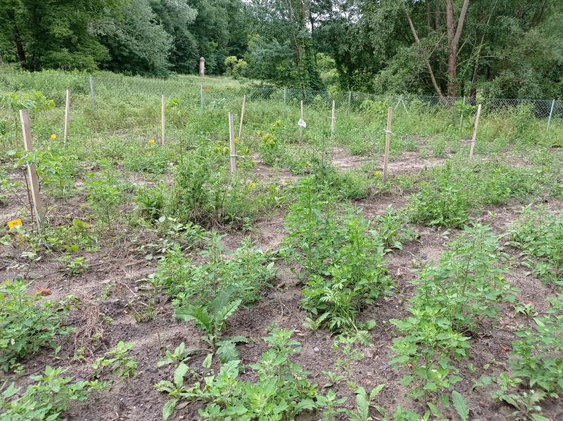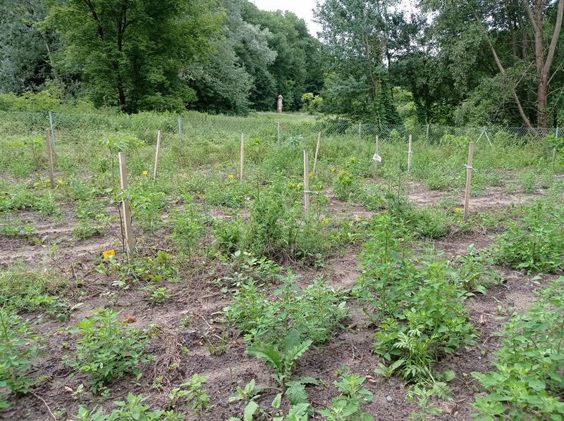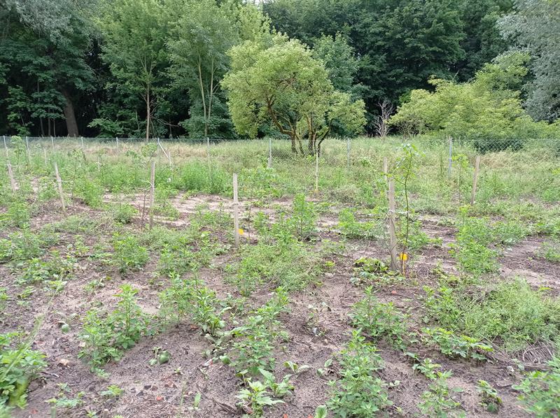Otoczony siatką teren w Parku Leśnym Arkońskim, opodal Syrenich Stawów. Z daleka - za sprawą uwiązanych do palików zielonych pędów - sprawia wrażenie zaniedbanej plantacji pomidorów. Tymczasem... w morzu chwastów rośnie las drzew, sadzonych ph. " Jedno dziecko, jedno drzewo".