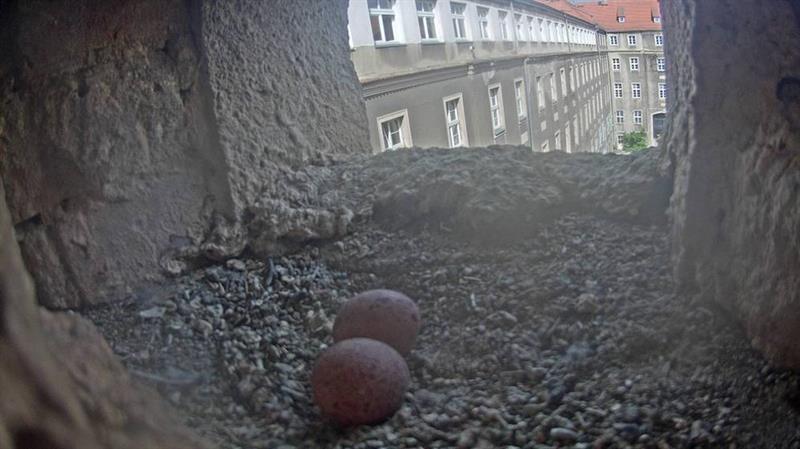 Para pustułek od kilkunastu dni – jak przekazuje Centrum Informacji Miasta – sprawdzała bezpieczeństwo „szpinakowego pałacu”. Gdy się upewniła, że nic nie zagraża ich przyszłemu lęgowi, samica w starym gnieździe złożyła jaja. Na razie dwa – jak widać w oku kamery, która śledzi wnętrze niszy skrzydlatych rezydentów magistratu. Natomiast na wlot do gniazda jest ustawiona druga z kamer, która również 24 godziny na dobę przekazuje w świat obraz pary gniazdującej w szczecińskim urzędzie.