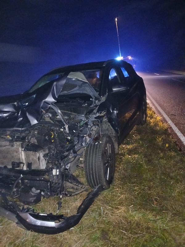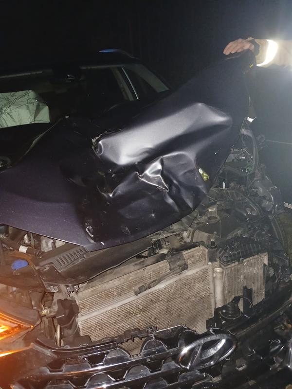 Na 5. kilometrze drogi wojewódzkiej nr 142 samochód osobowy marki Hyundai zderzył się z jeleniem, który niespodziewanie wbiegł na jezdnię tuż przed maskę auta. Kierowca nie dał rady wyhamować, doszło do zderzenia.