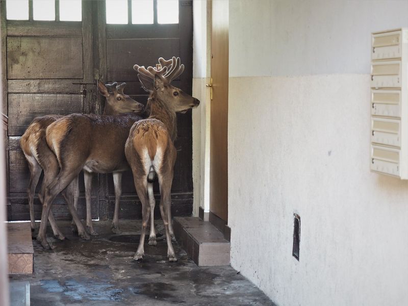 Trzy jelenie weszły na klatkę schodową kamienicy w szczecińskim Dąbiu. Na ratunek zwierzętom ruszył Łowczy Miejski.