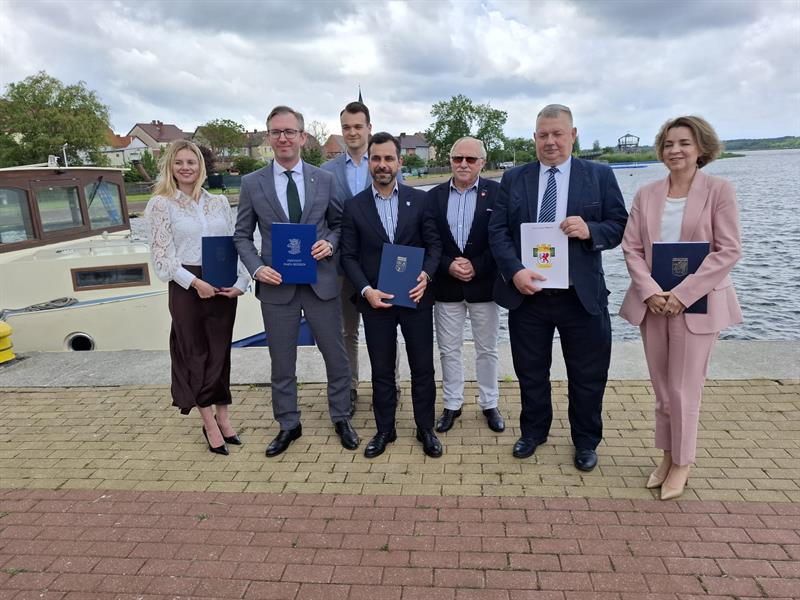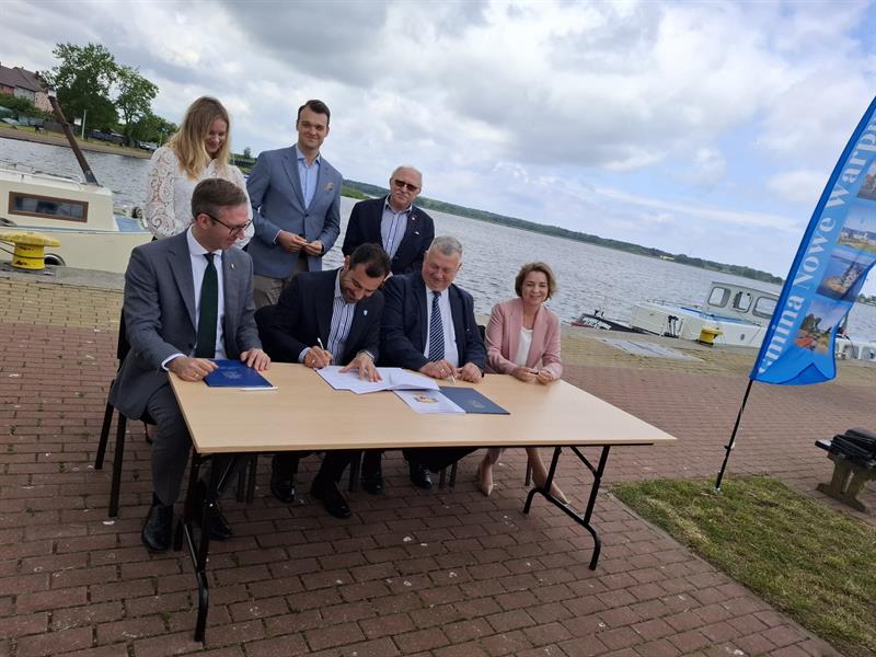W Alei Żeglarzy w Nowym Warpnie podpisano w piątek umowę w sprawie udzielenia dotacji celowych na realizację projektu „Samorządowy Szlak Wodny, pieszo - rowerowa przeprawa promowa po Zalewie Szczecińskim” pomiędzy partnerami projektu - Powiatem Polickim oraz gminami Szczecin, Nowe Warpno i Świnoujście. Fot. Starostwo Powiatowe w Policach