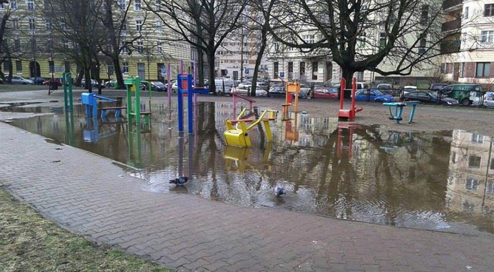 Tyle że to efekt działania natury, a nie kolejna z miejskich inwestycji wodnych. Chociaż... formalnie to siłownia pod chmurką, ustawiona przez Zakład Usług Komunalnych. Miała dać szansę na rozwijanie tężyzna fizycznej, a dostarcza - najwyraźniej - moc dodatkowych nieoczekiwanych wrażeń.