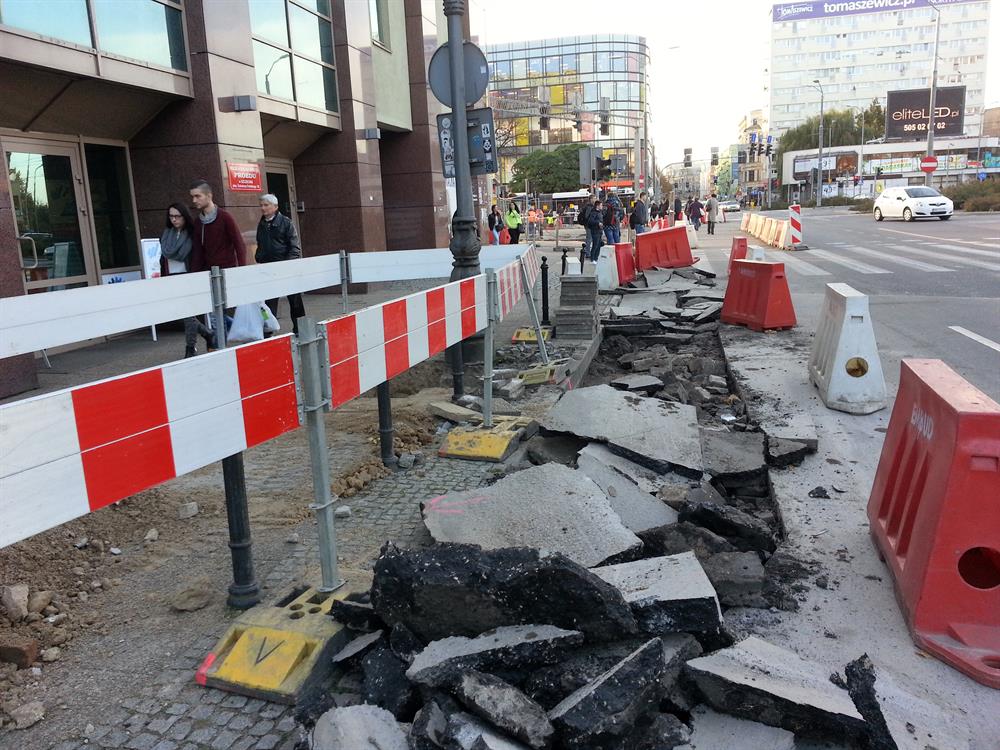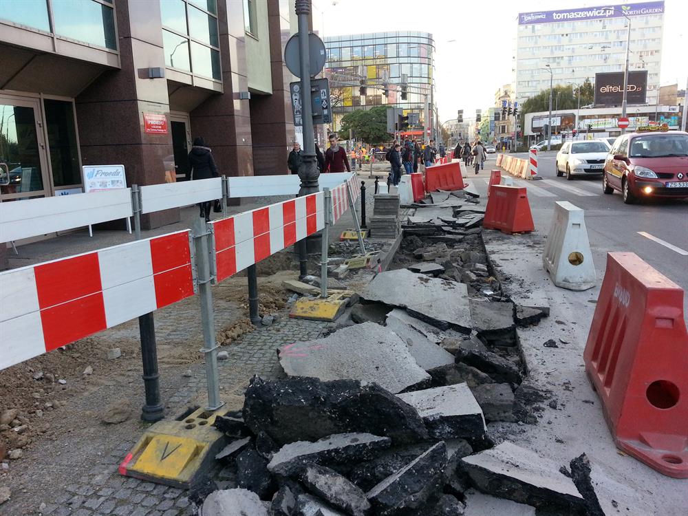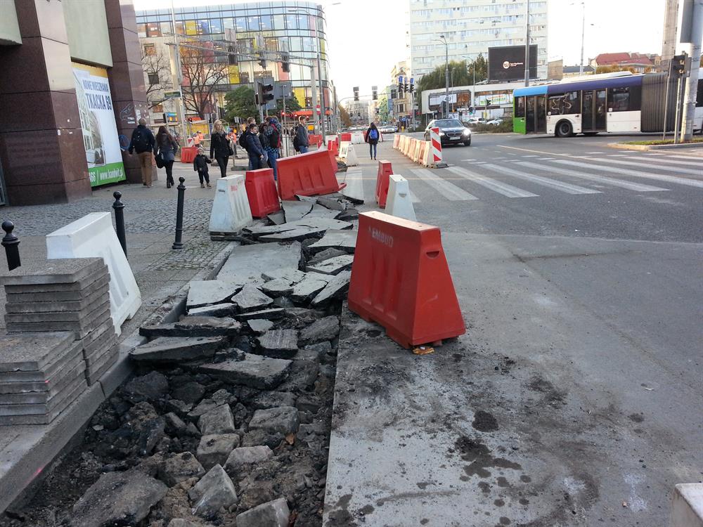 Remont w takim samym zakresie, jak na pobliskiej ul. Matejki, wykona spółka Strabag, której ZDiTM zlecił stosowną umową bieżące utrzymanie nawierzchni w mieście. W październiku fragment jezdni przy chodniku do wysokości ul. Tkackiej został już raz skuty (na zdj.) w związku z poprawkami odpływu deszczówki przy przejściu dla pieszych, będących w tym rejonie pokłosiem wcześniejszych niedoróbek przy okazji wymiany SEC-owskiego ciepłociągu przez spółkę Irma.