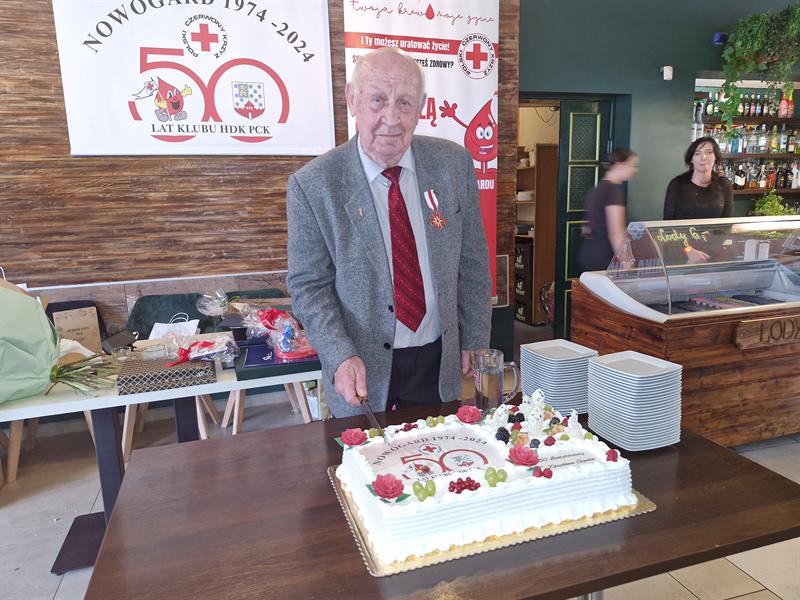 250 akcji krwiodawstwa poprzez mobilny punkt poboru krwi, około 19 tys. litrów oddanej krwi – tak wygląda podsumowanie 50-letniej działalności Klubu Honorowych Dawców Krwi w Nowogardzie, którego dokonano w minioną sobotę w gościnnych progach pizzerii „Neptun”. Był okolicznościowy tort, brawa, wręczona Złota Odznaka Honorowa Gryfa Zachodniopomorskiego, ale przede wszystkim ogromna wdzięczność za to, co robi z nowogardzkimi krwiodawcami założyciel i prezes Klubu Honorowych Dawców Krwi PCK w Nowogardzie Zdzisław Szmit.