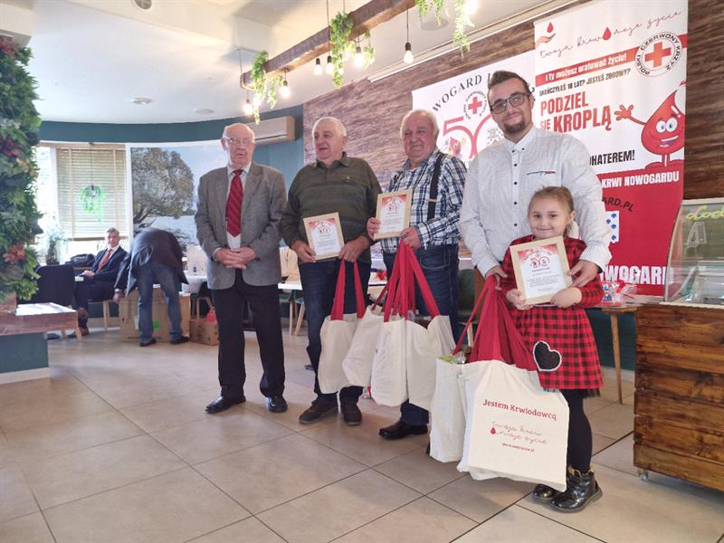 - Każdy ma coś, co może dać innym. Pamiętam początki. Były to lata 1963-1974 r. Wtedy powstawały i tworzyły się struktury związane z działalnością krwiodawstwa na tym terenie. Mój kolega Stefan zaprowadził mnie wówczas na ul. Wojska Polskiego 63 w Nowogardzie. Rok 1974 w historii Nowogardu został już zapisany jako rok powstania Klubu Honorowego Krwiodawców Polskiego Czerwonego Krzyża w Nowogardzie. Podstawowym zadaniem klubu jest wciąż zbiórka krwi oraz propagowanie idei bezinteresownego krwiodawstwa. Nowogardzki klub zrzesza w tej chwili 33 członków, ale grono sympatyków jest dużo szersze – powiedział Zdzisław Szmit, prezes Klubu HDK i Polskiego Czerwonego Krzyża w Nowogardzie. – Z okazji 50-lecia Klubu Honorowych Dawców Krwi w Nowogardzie chciałabym złożyć za pośrednictwem „Kuriera Szczecińskiego” podziękowania wszystkim krwiodawcom i przyjaciołom za dzielenie się tym najcenniejszym dobrem, ratowanie zdrowia i życia drugiego człowieka. Szczególnie podziękowania kieruję do przybyłych reprezentantów Regionalnego Centrum Krwiodawstwa i Krwiolecznictwa w Szczecinie: Grzegorza Szymańskiego, prezesa Zachodniopomorskiego Oddziału Okręgowego PCK, Joanny Łaskarzewskiej, dyrektor PCK w Szczecinie i dr Ewy Kłosińskiej, dyrektor RCKiK w Szczecinie.