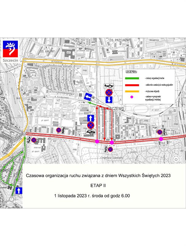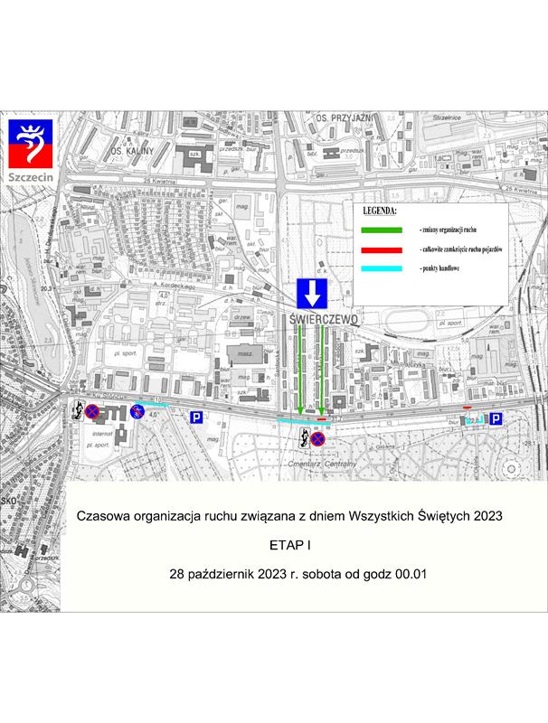 Zmieni się także organizacja ruchu wokół nekropolii. Od soboty zostanie wprowadzone ograniczenie prędkości na obu kierunkach ul. Mieszka I od wiaduktu kolejowego do ul. Wierzbowej do 40 km na godz. Kolejna zmiana to wprowadzenie ruchu jednokierunkowego w ciągu ul. Karola Miarki i ul. Pięknej w Szczecinie (aż do dnia 1.11.2023 r). Obie jezdnie ul. Ku Słońcu będą otwarte dla ruchu ogólnego z pewnymi zmianami w organizacji ruchu na jezdni południowej. Zmiana przy cmentarzu w Dąbiu to wprowadzenie ograniczenia prędkości w ciągu ul. Goleniowskiej do 40 km na godz. oraz wprowadzenie ruchu jednokierunkowego w ciągu ul. Jugosłowiańskiej do ul. Toruńskiej i ul. Czarnogórskiej od ul. Jugosłowiańskiej do ul. Bośniackiej. W Zdrojach zaplanowano zamknięcie dla ruchu ogólnego ul. Poległych od ul. Walecznych. Dojazd tylko pojazdów zaopatrzenia.