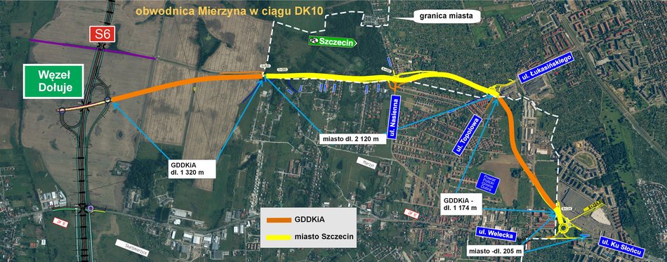 Biegnąca obecnie przez Mierzyn DK10 nie byłaby w stanie obsłużyć dodatkowego ruchu, dlatego potrzebny jest nowy przebieg tej drogi. Zapewni on właściwy dojazd do ekspresowej obwodnicy Szczecina. Początkiem drogi od strony Szczecina będzie skrzyżowanie na końcu ulicy Ku Słońcu w rejonie istniejącego centrum handlowego. Ten początkowy fragment, o długości ponad 200 m, to teren Miasta Szczecin. Dalej trasa będzie biegła w kierunku północnym, do połączenia ulic Topolowej i Łukasińskiego. Za ten odcinek o długości ok. 1,2 km będzie odpowiedzialna GDDKiA. Następnie droga ponownie wejdzie na teren Szczecina i będzie biegła w kierunku zachodnim, przechodząc częściowo przez teren ogródków działkowych. Po ok. 2,1 km trasa opuści teren miasta. Dalej nowa DK10 po pokonaniu ok. 1,3 km dotrze do węzła Szczecin Zachód (Dołuje). Za ten ostatni fragment również odpowiada GDDKiA.