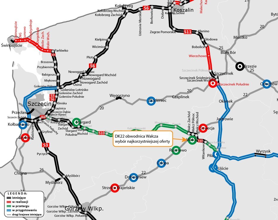 Po analizie i ocenie ofert w przetargu na budowę obwodnicy Wałcza (w ciągu DK22) za najkorzystniejszą Generalna Dyrekcja Dróg Krajowych i Autostrad uznała tę złożoną przez firmę PORR. Zaproponowana przez nią cena to 175,64 mln zł.