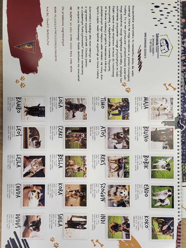 - Dodatkowe kalendarze dodrukowaliśmy dzięki wsparciu Zakładu Usług Komunalnych oraz prywatnego sponsora: polsko-norweskiej spółki CSP Customer Services Polska. Za co jesteśmy bardzo wdzięczni. Podobnie jak za inicjatywę, dzięki której nasze psy i koty, w takiej pięknej odsłonie, mogą zaprezentować się szerokiemu gronu kibiców i nie tylko - mówi Ewa Mrugowska, kierująca Schroniskiem dla Bezdomnych Zwierząt w Szczecinie.