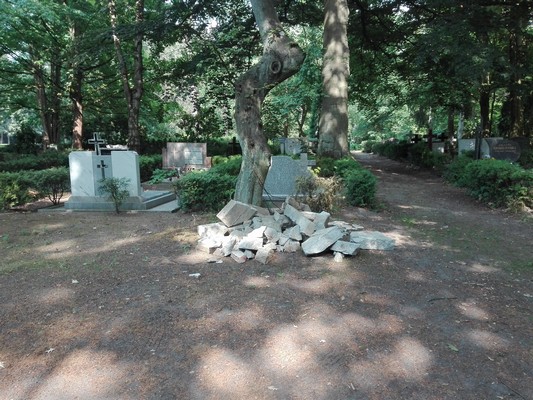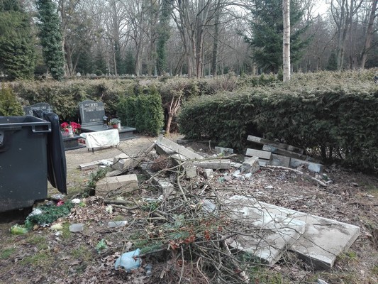 To obrazek codzienny na Cmentarzu Centralnym w Szczecinie. Jest to „dzieło” kamieniarzy, którzy stawiają nowe pomniki na grobach, a to co z nich zostanie rzucają gdzieś obok lub koło śmietników. Tak postępują nieuczciwi rzemieślnicy, którzy wiedzą, że mają obowiązek stare betonowe elementy wywieźć z terenu cmentarza i zutylizować, ale to przecież kosztuje. Lepiej porzucić je na cmentarzu i niczym się nie przejmować.