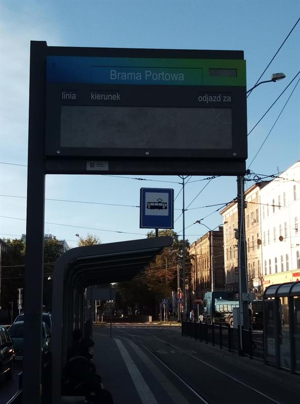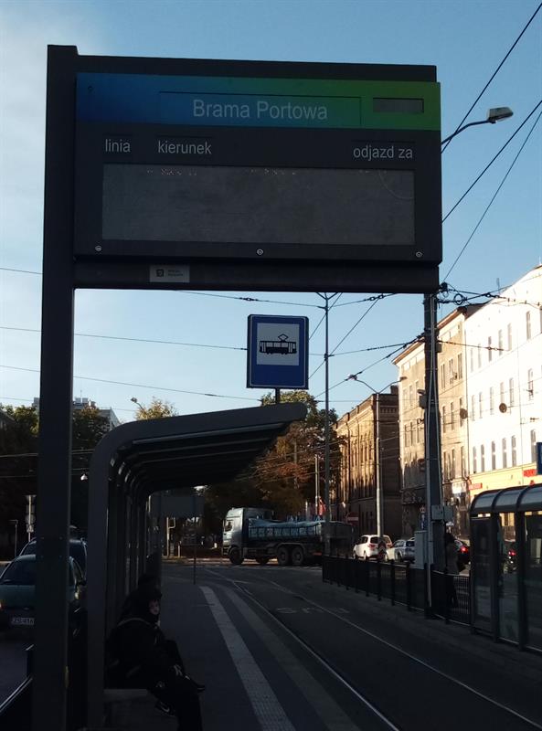 Kolejne trzy tablice mają zakłócenia w pojedynczych wierszach. To tablice przy ul. Krzywoustego, Rondzie Ułanów Podolskich w kierunku ul. Struga oraz na przystanku tramwajowym na Basenie Górniczym. Takie usterki powinny zniknąć w ciągu doby.