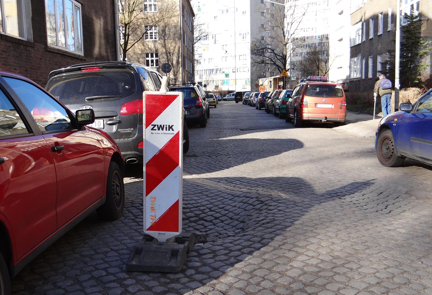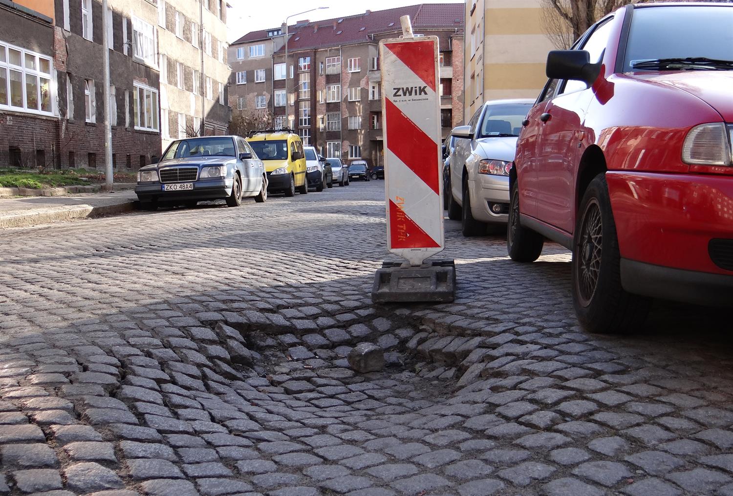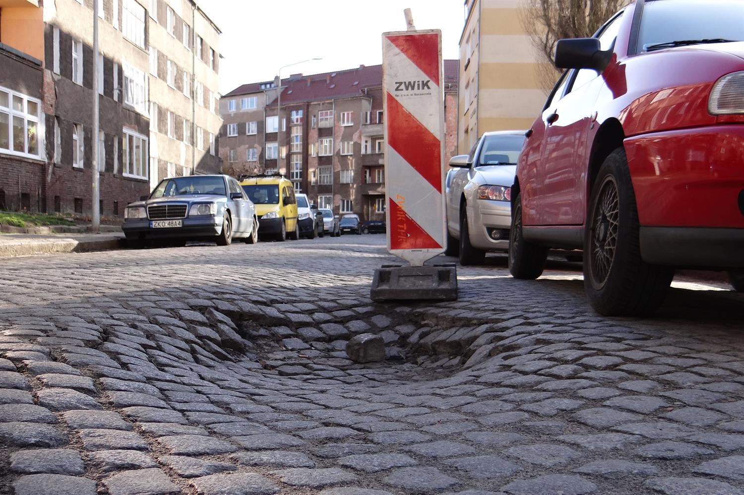 Na takie zapadlisko w brukowanej nawierzchni jezdni kierowcy natkną się na szczecińskim Niebuszewie-Bolinku. Niespodzianka znajduje się na jednokierunkowym mocno sfatygowanym na całej długości odcinku ul. Franciszka Karpińskiego. O tym głębokim już na około pół metra, a szerokim na około półtora metra zapadlisku ostrzega tam ustawiony po interwencjach okolicznych mieszkańców ZWiK-owski pachoł. Minęły ponad dwa tygodnie sygnalizowania pilnej potrzeby wykonania naprawy. Nie dzieje się nic. Czyżby kolejne miejsce z listy tych, które muszą nabrać urzędniczej nie)mocy nim ktokolwiek zabierze się do roboty? ©℗