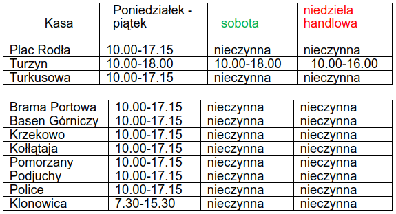 I tak, kasy biletowe przy pl. Rodła, Bramie Portowej, na pętlach Basen Górniczy, Turkusowa, Krzekowo, Kołłątaja, Pomorzany, Podjuchy oraz w Policach są otwarte w godz. 10-17.15. Ta w siedzibie ZDiTM przy ul. Klonowica w godz. 7.30-15.30. Natomiast kasa Turzyn jest czynna w dni powszednie, w soboty w godz. 10-18, aw niedziele handlowe w godz. 10-16.
