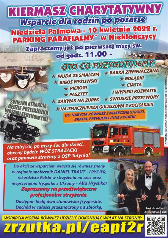 Kiermasz charytatywny, którego celem jest wsparcie rodzin po pożarze, odbędzie się w tę niedzielę 10 kwietnia na parkingu parafialnym w Niekłończycy. Początek - godz. 11.