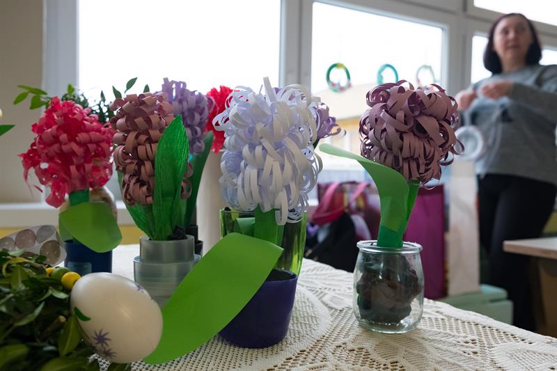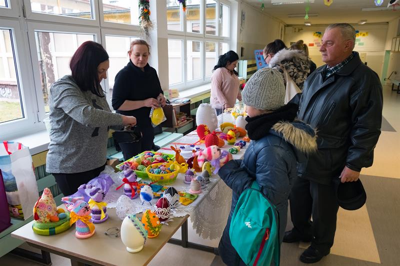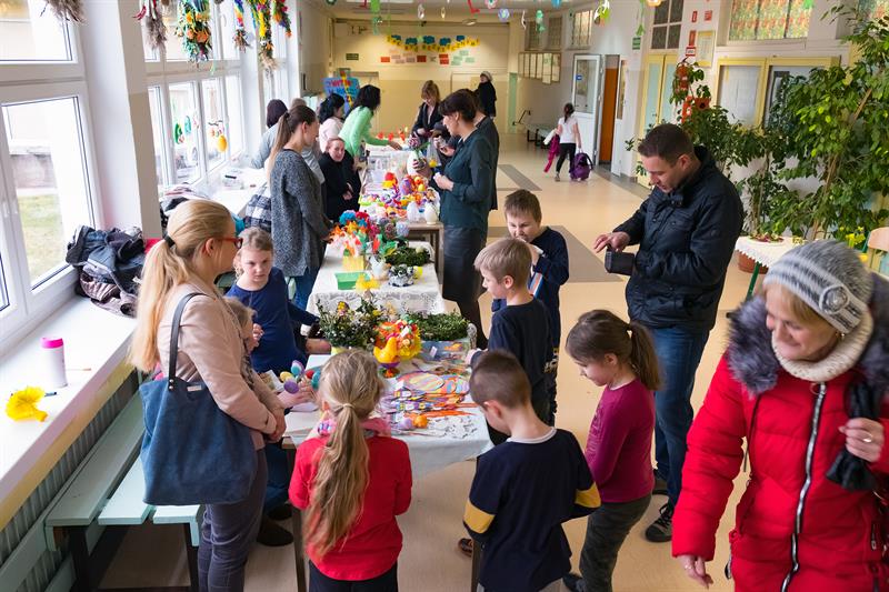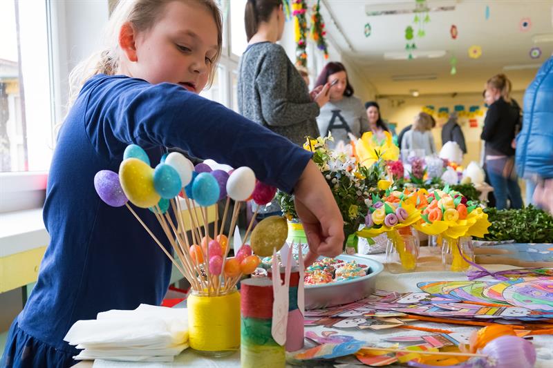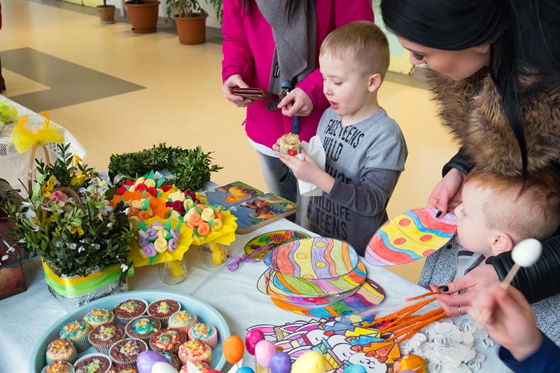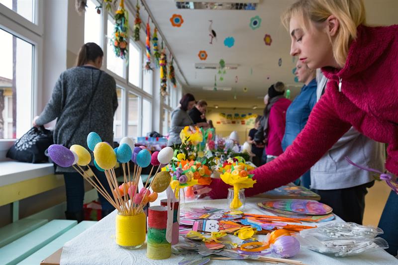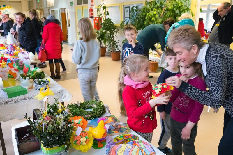 Zaangażowane były klasy 0-3. Dzieci włączyły się także do zrobienia kolorowych palm. Stoły zapełniły się koszyczkami, barankami, kurczaczkami. Dużą atrakcją były mazurki świeżo upieczone przez rodziców, którzy chętnie towarzyszyli dzieciom w kiermaszu.