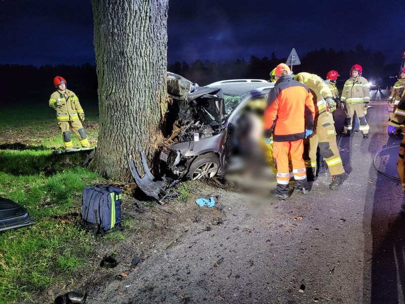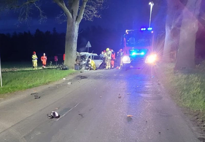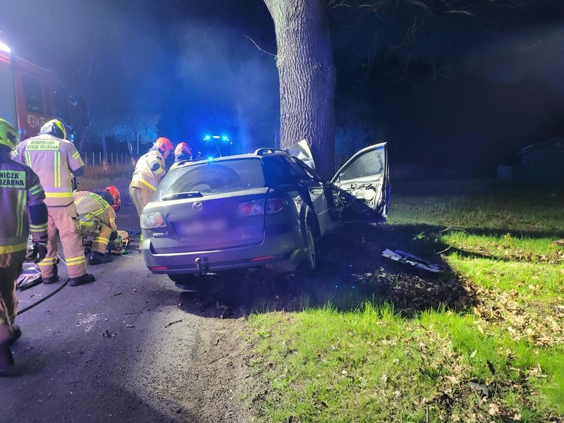 Samochód osobowy uderzył tam w drzewo. Zgłoszenie w sprawie wypadku straż pożarna w Goleniowie otrzymała o godz. 4.41.