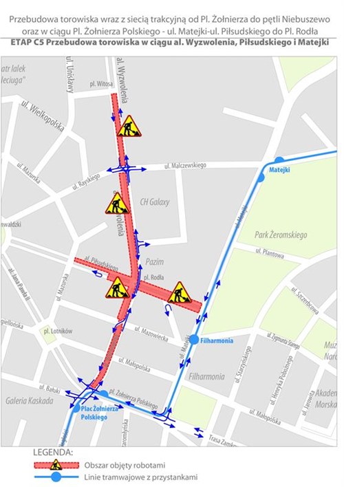 Najważniejsze to całkowite wstrzymanie ruchu tramwajów trasami przez al. Piłsudskiego od pl. Szarych Szeregów do pl. Rodła i w al. Wyzwolenia od ronda Giedroycia oraz na ulicach Nowej i Dworcowej. Na obu trasach do Pomorzan tramwaje póki co będą jeździć tyle że z taką różnicą, że do pętli przy ul. Budziszyńskiej dojadą zmienioną trasą także składy linii 1. A odwieszone „trójki” obsłużą tymczasowo całkiem nową relację od pętli przy ul. Szafera, przez ul. Arkońską i Niemierzyńską do ronda Giedroycia. Dla kierowców jedyną dobrą wiadomością na najbliższych kilka miesięcy jest ta, że po remoncie fragmentu jezdni od wysokości gmachu ZUS będą mogli bez większych przeszkód ponownie jeździć w obu kierunkach jezdniami ul. Matejki, ale nadal tylko na wprost.