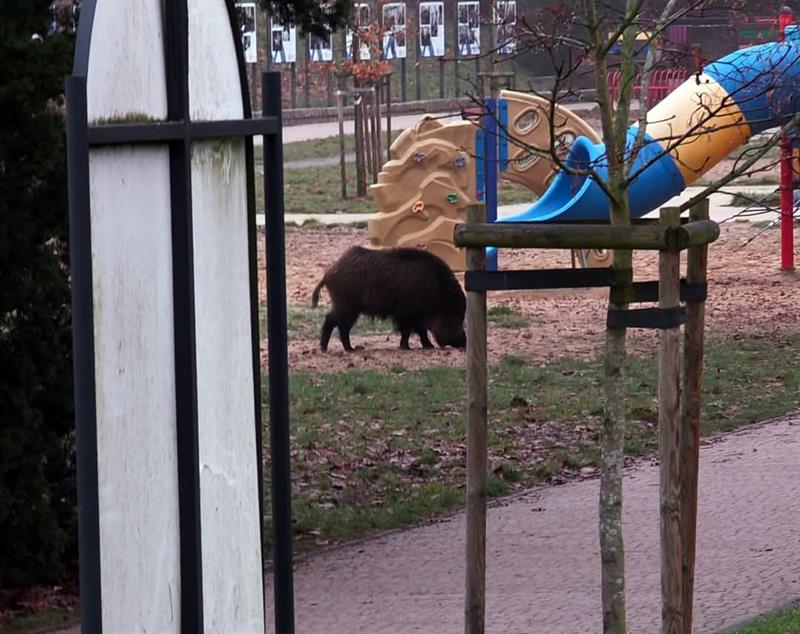 Spacerującego po placu zabaw dla dzieci dzika wypatrzył w parku Chrobrego w niedzielny poranek pan Tomasz, mieszkaniec Stargardu.