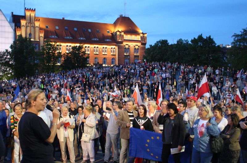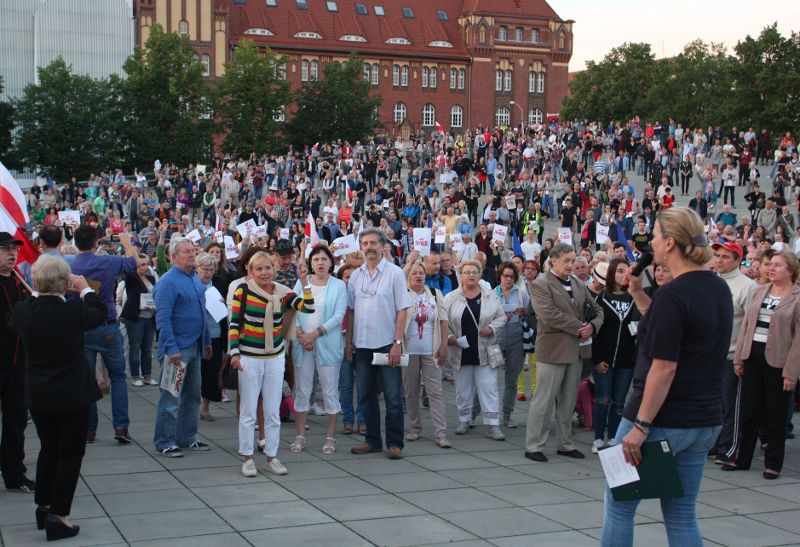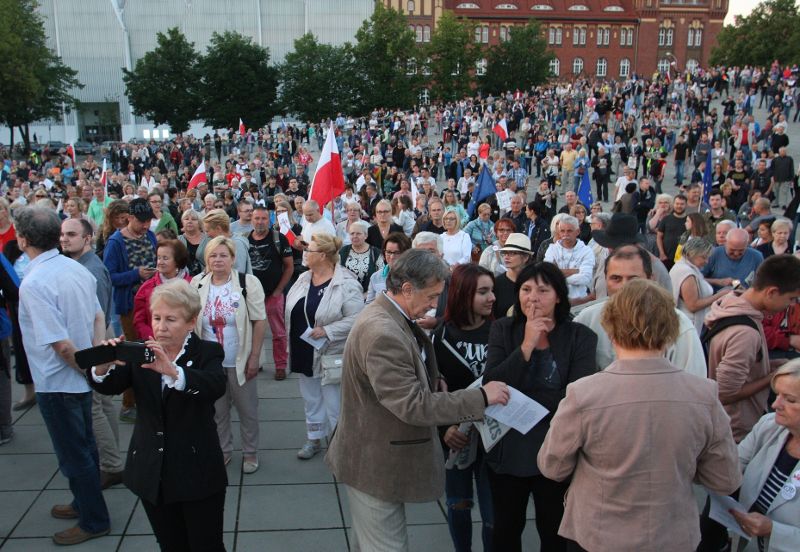 Nie przed sądem, lecz na pl.Solidarności odbył się wieczorem 23 lipca w Szczecinie protest przeciwników zmian w wymiarze sprawiedliwości. Został przeniesiony dla bezpieczeństwa - na chodniku przy pl. Żołnierza Polskiego ludzie się już nie mieścili.