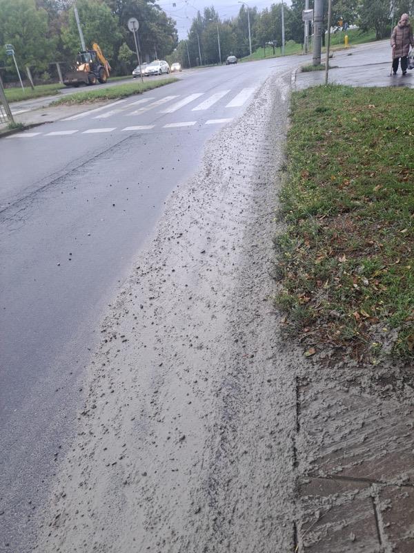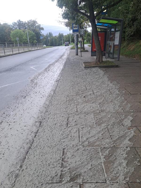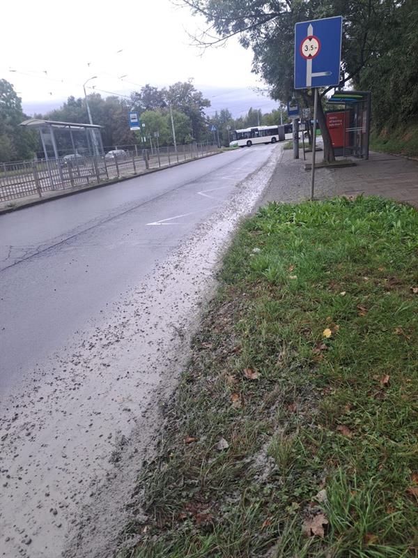 Kilometrowa "ścieżka" z płynnego betonu. Zanieczyszczenia na jezdni, poboczu, przystanku