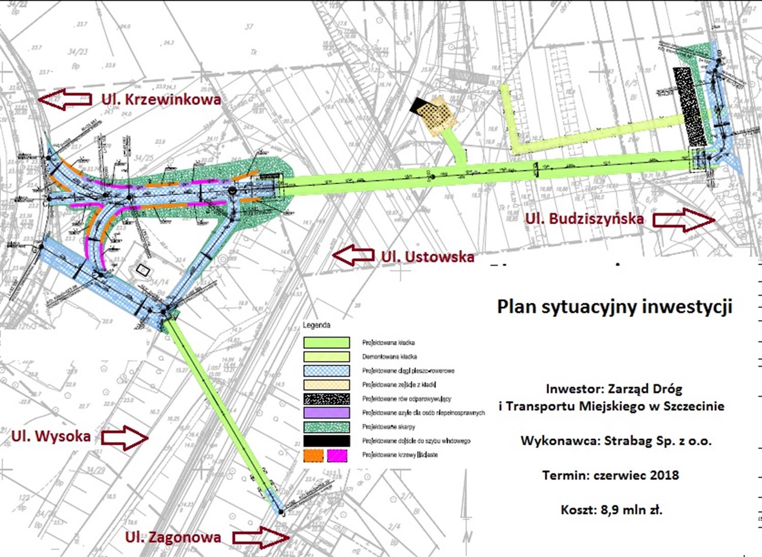 Z początkiem lata 2018 roku najprawdopodobniej dwoma kładkami, w tym jedną nową, mieszkańcy szczecińskich Pomorzan i nie tylko oni będą mogli pokonywać trasę nad torami magistrali kolejowej od ul. Budziszyńskiej na tereny zabudowy mieszkaniowej, które znajdują się na wzniesieniach przy ulicach: Zagonowej, Ustowskiej czy Krzewinkowej bądź w przeciwnym kierunku. Tak przynajmniej wynika z zawartej umowy na tę inwestycje między zlecającym ZDiTM i spółką Strabag, wykonawcą.