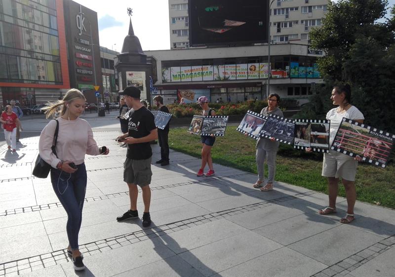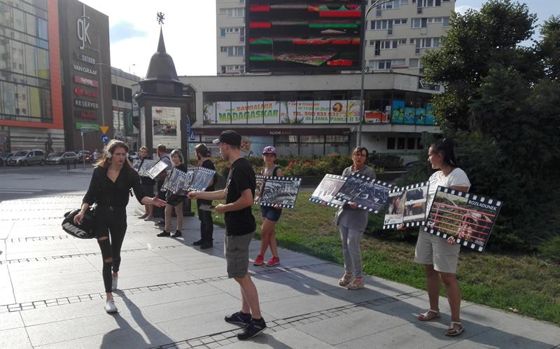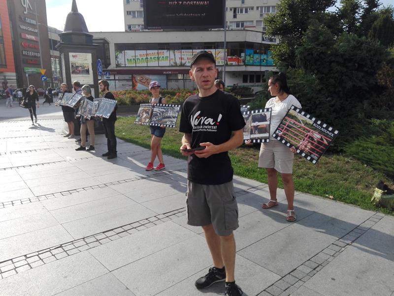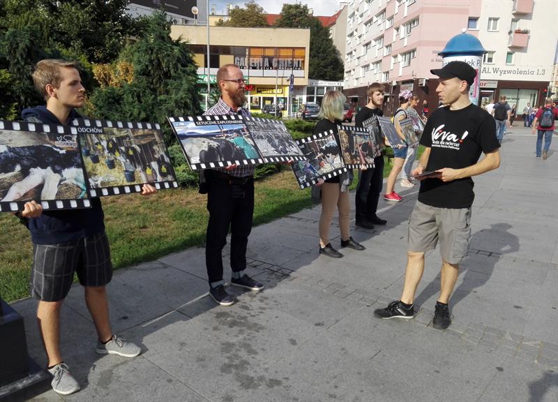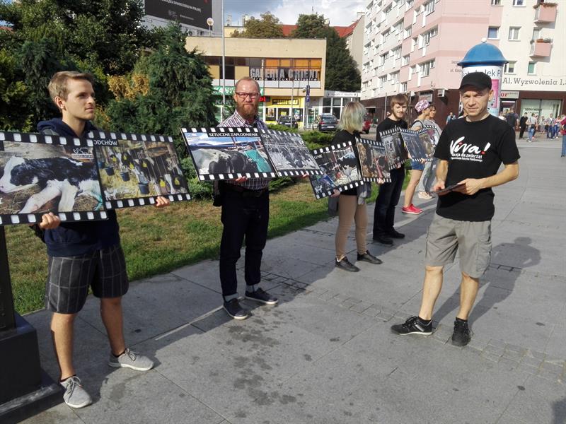 Happening odbył się w środę (5 bm.) na pl. Żołnierza Polskiego. Była to kolejna odsłona objazdowej akcji ulicznej ph. „Klatka po klatce". Jej uczestniczy trzymali plansze - stylizowane na klatki filmowe - przedstawiając kolejne epizody koszmaru, jakim jest proces przemysłowej hodowli krów, wykorzystywanych do produkcji mleka. Także ulotkami starali się zwrócić uwagę przechodniów na następujące fakty: