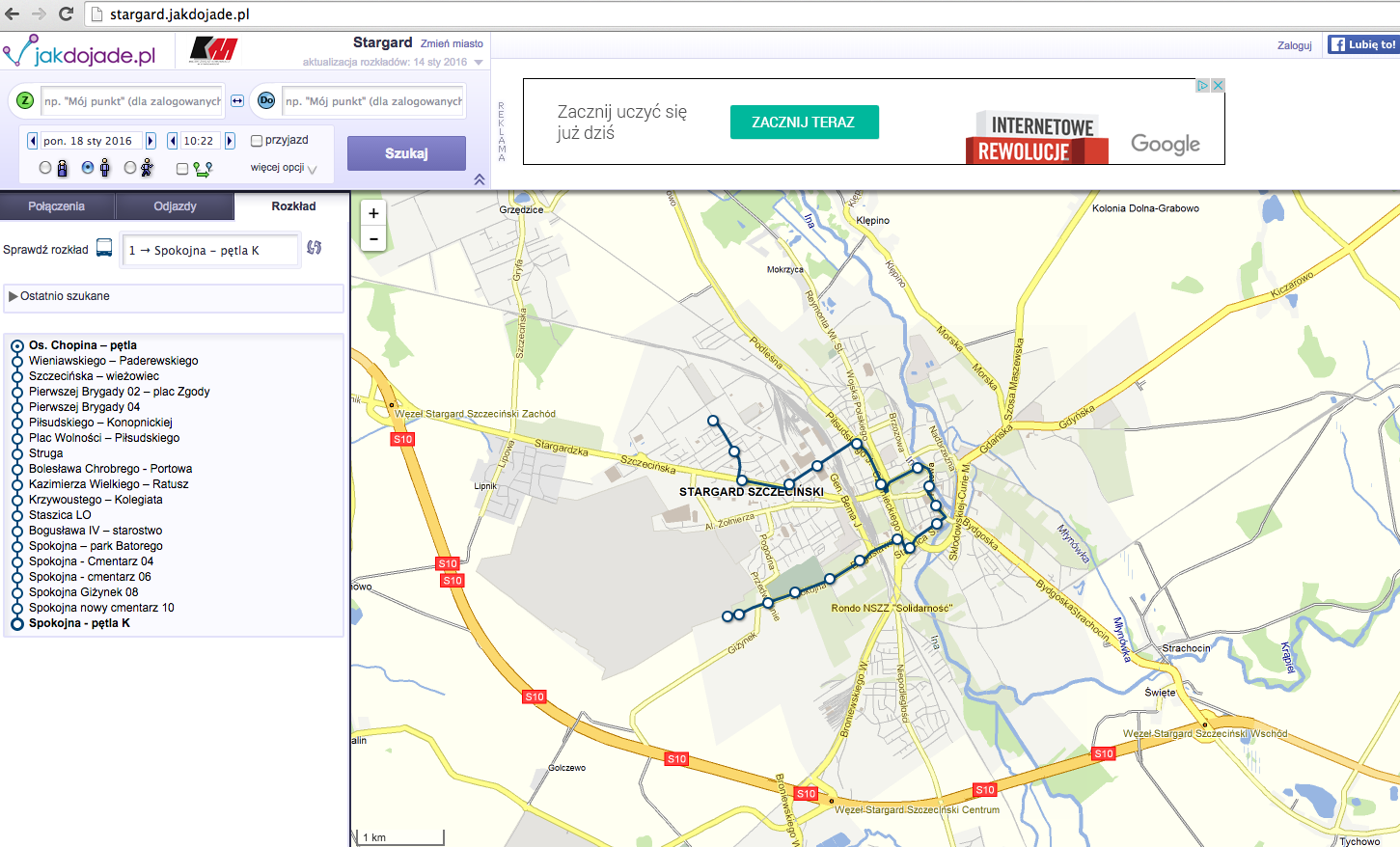 Wyszukiwarka wskazuje także skomunikowane połączenia przesiadkowe, prezentując dokładny przebieg trasy i mapę. Platforma jakdojade.pl funkcjonuje już w ponad 20 innych polskich miastach, m.in. w Bydgoszczy, Krakowie, Poznaniu, Szczecinie i Warszawie. Dostępna jest także bezpłatna, mobilna wersja aplikacji dla użytkowników smartfonów.