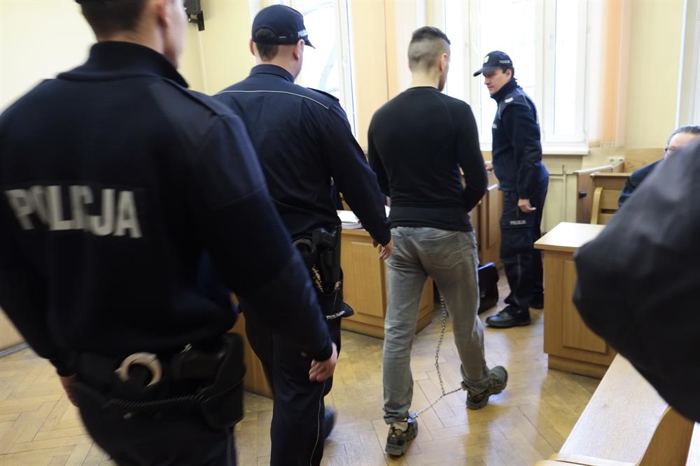 Radosława Warawko policjanci przyprowadzają skrępowanego, z łańcuchami na rękach i nogach.