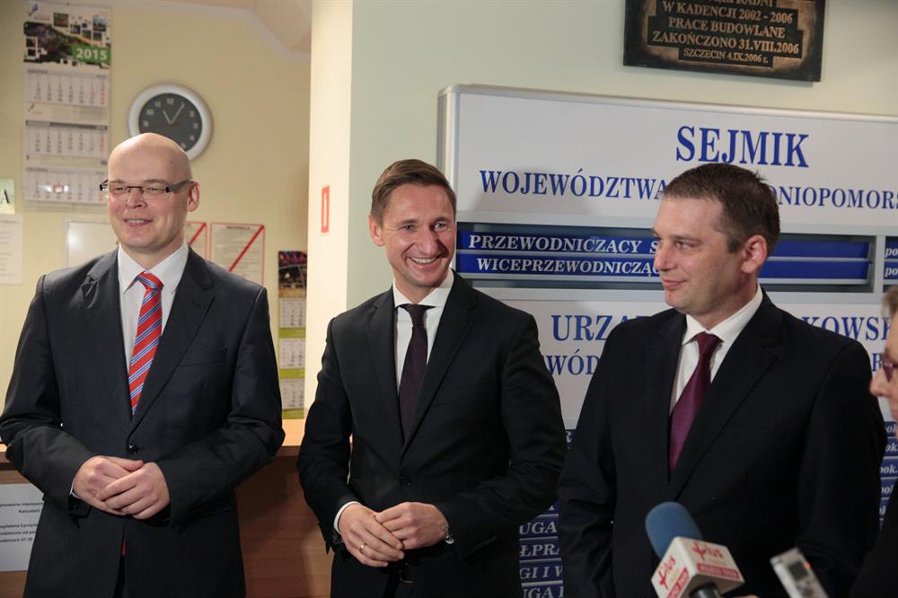 Obok Nycza w holu sejmiku stali pozostali sygnatariusze porozumienia - radny Adam Ostaszewski i marszałek Geblewicz (PO). Nie było wicemarszałka Jarosława Rzepy (PSL), bo jak usłyszeli dziennikarze, porozumienie jest podpisane marszałkiem. Poza tym zachodniopomorski lider ludowców jest na urlopie.