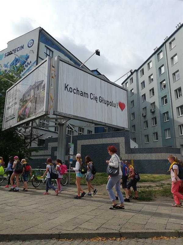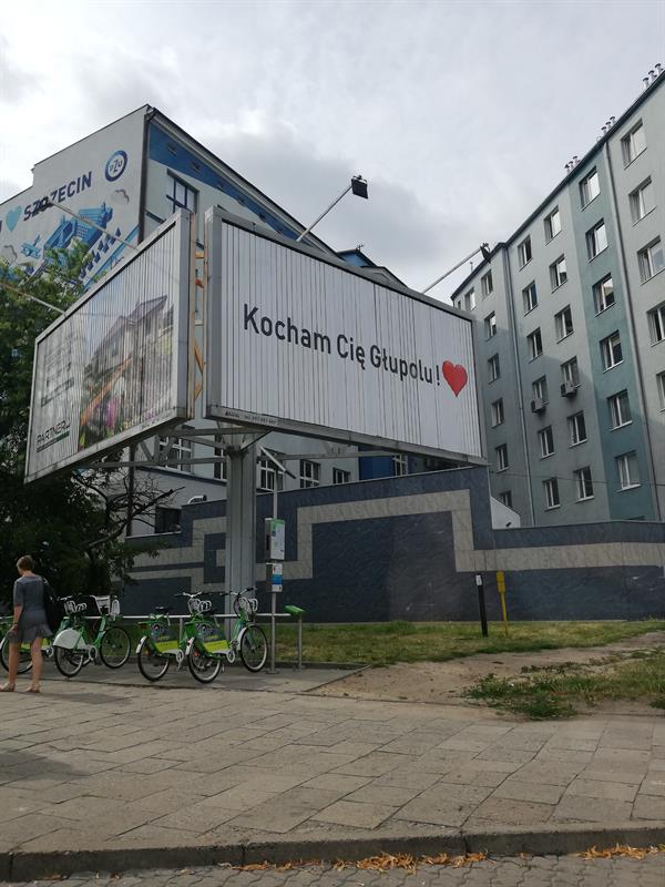 Ciekawe, czy Głupol zobaczy skierowane do siebie wyznanie? Jeśli będzie przechodził przez plac Rodła w Szczecinie, to trudno, żeby nie zauważył, jest - co się zowie - wielkoformatowe i daje po oczach nawet mało spostrzegawczym. A jeśli już zobaczy, to ciekawe czy weźmie je do siebie - innymi słowy, czy zapewnienia miłości trafią do właściwego Głupola i odniosą spodziewany skutek, czyli przekonają go o uczuciu oraz (domniemujemy) bezsensowności focha i będzie happy end? A może, było nie było, uniwersalny przekaz trafi na zupełnie przypadkowego Głupola (Głupoli) i miłosnych happy endów będzie więcej? Oby! Trzymajmy się tej romantycznej wersji, dopóki nie okaże się, że to znowu tylko jakaś reklama.