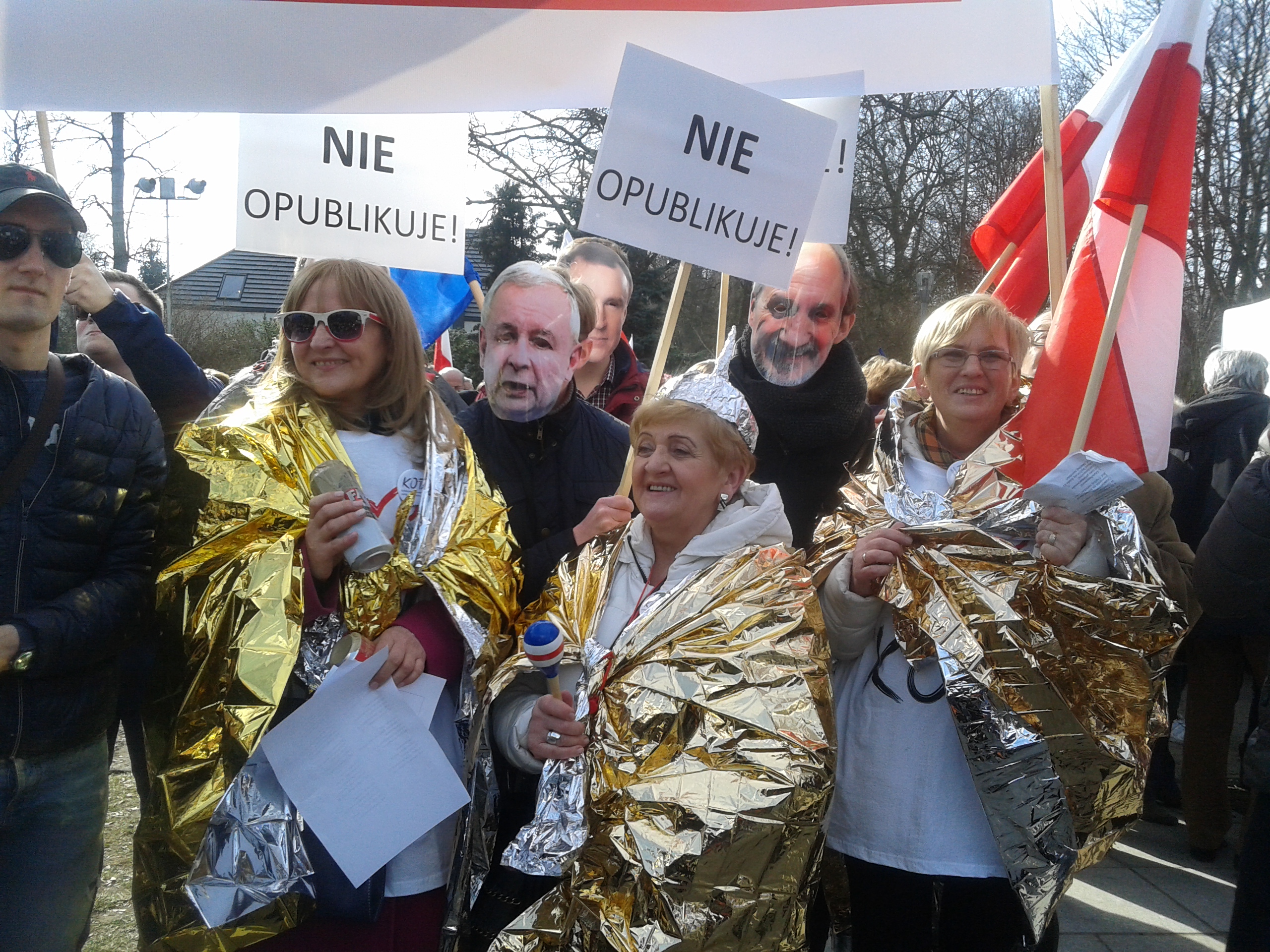 A grupa kobiet okrytych folie termiczne formowała na swoich głowach hełmy z folii aluminiowej, które jak usłyszeliśmy później, chronią przed promieniowaniem Maciewiecza. Uśmiechnięte panie robiły sobie zdjęcia z mężczyznami, którzy na manifestację przyszli w maskach Jarosława Kaczyńskiego i Antoniego Macierewicza.