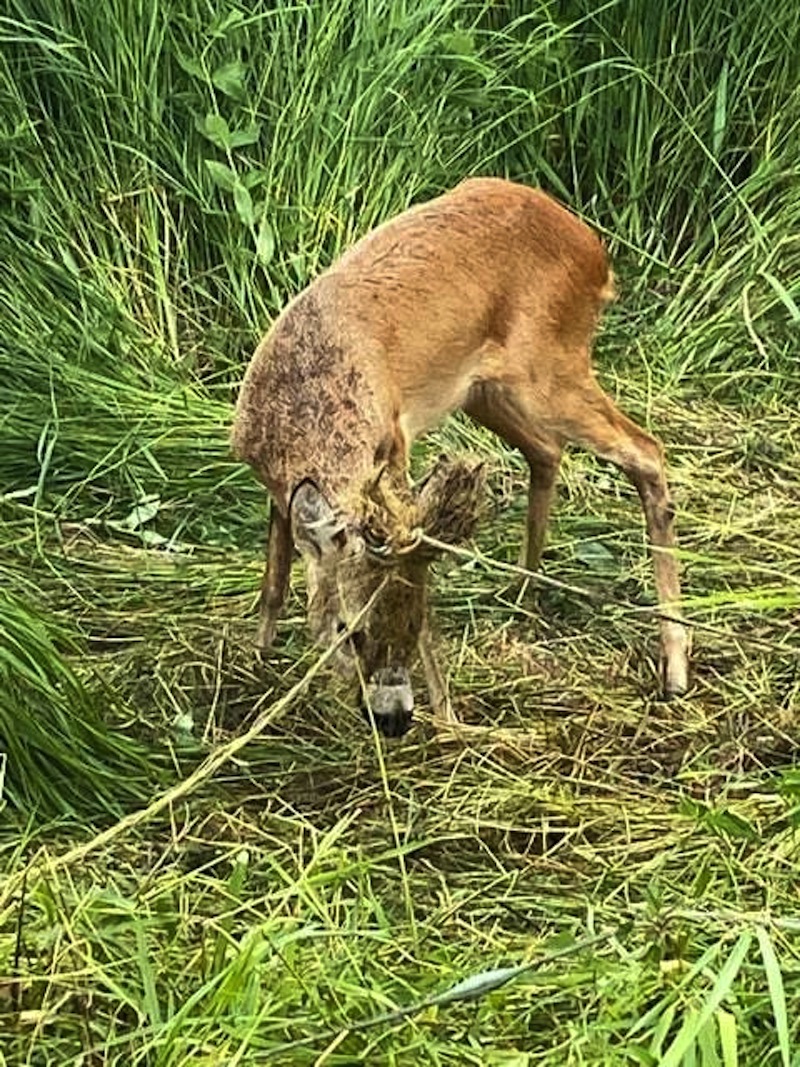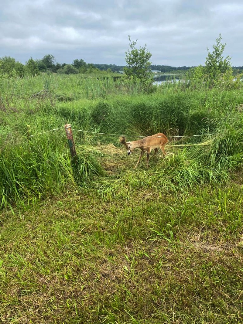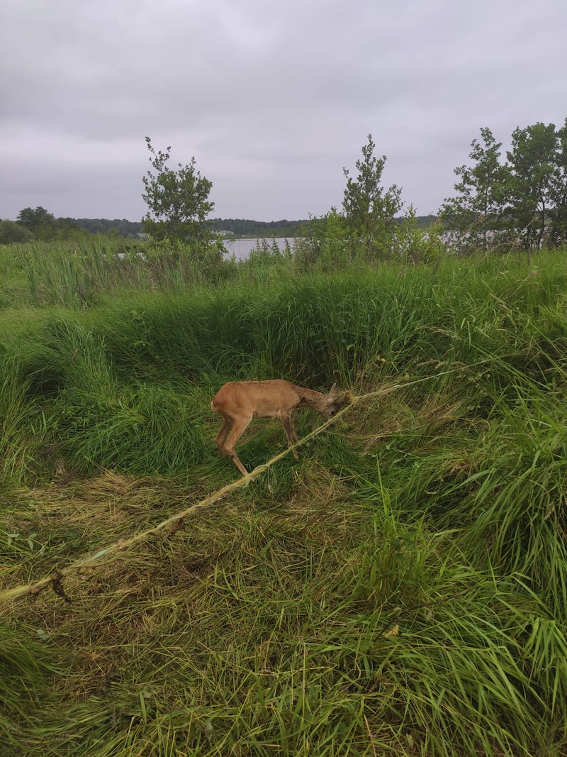 Dwoje turystów podczas spaceru w pobliżu jeziora w miejscowości Pogorzelica usłyszało odgłosy szamotania. Podchodząc bliżej zauważyli sarnę owiniętą w linki siatki rybackiej. Spacerowicze zawiadomili pracowników Nadleśnictwa Gryfice (Regionalna Dyrekcja Lasów Państwowych w Szczecinie).