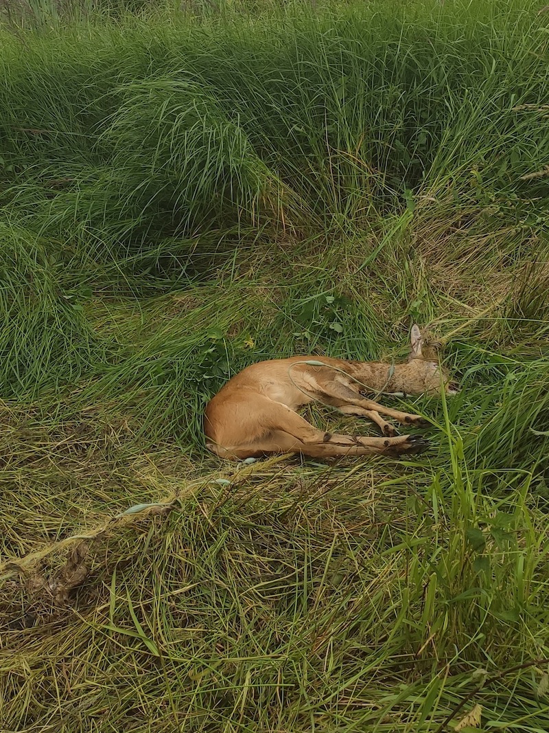 Podleśniczy Leśnictwa Mrzeżyno podjął wraz z turystami działania celem uwolnienia zaplątanego zwierzęcia, odcinając żyłki siatki. Gdyby nie ich interwencja zwierzę zginęłoby w męczarniach. Na szczęście wszystko dobrze się skończyło.