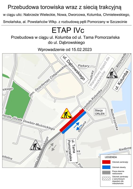 Wzdłuż ul. Kolumba na odcinku od skrzyżowania z ul. Tama Pomorzańska do skrzyżowania z ul. Zapadłą i ul. Dąbrowskiego planowane jest zamknięcie połowy jezdni po zachodniej stronie z umożliwieniem ruchu w obu kierunkach po wschodniej stronie jezdni. Ponadto zmieni się lokalizacja przystanku „Tama Pomorzańska” (na żądanie) dla linii 242 w kierunku Pargowa. Autobusy zatrzymywać się będą na przystanku zlokalizowanym w ciągu ul. Tama Pomorzańska za skrzyżowaniem z ul. Kolumba.