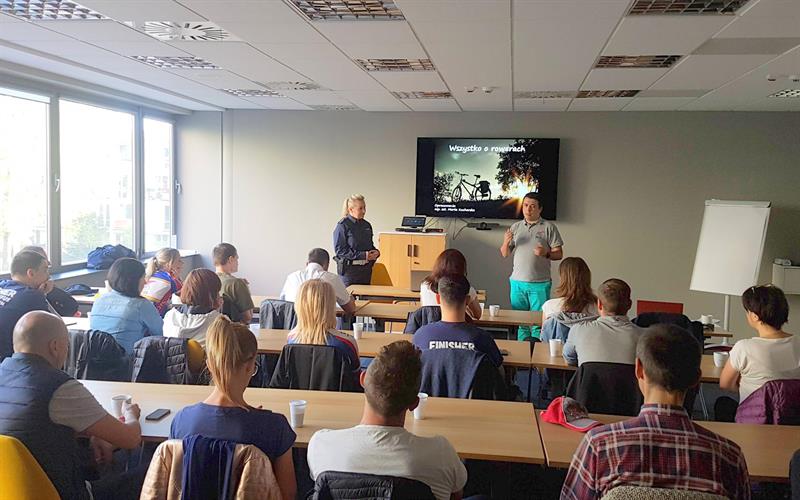 Blok szkoleń obejmował spotkanie z policjantką z Wydziału Ruchu Drogowego Komendy Miejskiej Policji w Szczecinie, która przypomniała rowerzystom przepisy z ustawy Prawo o ruchu drogowym i kurs udzielania pierwszej pomocy prowadzony przez ratowników medycznych.